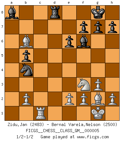 Last move : 1/2-1/2 2021 August 18 10:18:32 [Event "FICGS__CHESS__CLASS_GM__000005"] [Site "FICGS"] [Date "2021.03.16"] [Round "1"] [White "Zidu,Jan"] [Black "Bernal Varela,Nelson"] [Result "1/2-1/2"] [WhiteElo "2483"] [BlackElo "2500"] 1.Nf3 e6 2.g3 d5 3.Bg2 Nf6 4.d4 Be7 5.c4 O-O 6.O-O dxc4 7.Qc2 a6 8.Qxc4 b5 9.Qc2 Bb7 10.Bf4 Nc6 11.Nc3 Nb4 12.Qd2 c5 13.dxc5 Bxc5 14.Qxd8 Rfxd8 15.a4 Ne4 16.Nxe4 Bxe4 17.Rfc1 Be7 18.axb5 axb5 19.Rxa8 Bxa8 20.Be3 Bf6 21.Bb6 1/2-1/2 Reti Opening Kingside Castling by player Black (move 5) Kingside Castling by player White (move 6) This chess game ended in a draw. Follow this game move after move (download)When you don't know what to play, wait for an idea to come into your opponent's mind. You may be sure that idea will be wrong. (Siegbert Tarrasch) Ich kämpfe solange mein Gegner einen Fehler machen kann. (Emanuel Lasker) Puntos débiles o agujeros en la posición de tu oponente deben de ser ocupados por piezas, no Peones. (Siegbert Tarrasch) La vie et les Echecs sont tous les deux une lutte constante. (Lasker) The Internet is the first thing that humanity has build that humanity doesn't understand, the largest experiment in anarchy that we have ever had. (Eric Schmidt)