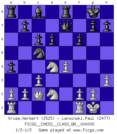 Last move : 1/2-1/2 2021 April 15 11:43:37 [Event "FICGS__CHESS__CLASS_GM__000005"] [Site "FICGS"] [Date "2021.03.16"] [Round "1"] [White "Kruse,Herbert"] [Black "Larwinski,Paul"] [Result "1/2-1/2"] [WhiteElo "2525"] [BlackElo "2477"] 1.e4 e5 2.Nf3 Nc6 3.Bb5 Nf6 4.d3 Bc5 5.Bxc6 dxc6 6.O-O Nd7 7.c3 O-O 8.d4 Bd6 9.Bg5 f6 10.Bh4 a5 11.Nbd2 a4 12.h3 Qe7 13.Bg3 exd4 14.Bxd6 cxd6 15.Nxd4 Nc5 16.Qc2 Re8 1/2-1/2 Ruy Lopez : Berlin defense Kingside Castling by player White (move 6) Kingside Castling by player Black (move 7) This chess game ended in a draw. Follow this game move after move (download)The game of Chess is not merely an idle amusement; several very valuable qualities of the mind are to be acquired and strengthened by it, so as to become habits ready on all occasions; for life is a kind of Chess. (Benjamin Franklin) Dass jemand wie Surab Asmaiparaschwili, der selbst Elopunkte gekauft hat , Vize-Präsident der Fide werden konnte, sagt schon einges über den Zustand dieser Organisation aus. (Joel Lautier) El Ajedrez por encima de todo... ¡es una pelea!. (Emanuel Lasker) Psychologiquement, tu dois avoir confiance en toi même, mais cette confiance doit être basée sur des faits. (Robert Fischer) The best weapon against an enemy is another enemy. (Friedrich Nietzsche)
