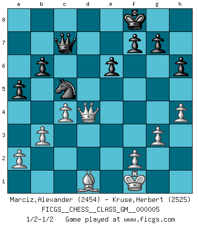 Last move : 1/2-1/2 2021 May 3 1:6:13 [Event "FICGS__CHESS__CLASS_GM__000005"] [Site "FICGS"] [Date "2021.03.16"] [Round "1"] [White "Marciz,Alexander"] [Black "Kruse,Herbert"] [Result "1/2-1/2"] [WhiteElo "2454"] [BlackElo "2525"] 1.d4 Nf6 2.c4 e6 3.Nf3 d5 4.g3 Bb4+ 5.Bd2 Be7 6.Bg2 O-O 7.Qc2 c6 8.O-O b6 9.Rd1 Nbd7 10.b3 h6 11.Bc3 Bb7 12.Nbd2 Rc8 13.e4 Qc7 14.Rac1 dxe4 15.Nxe4 c5 16.Nxf6+ Bxf6 17.Qe2 Rfd8 18.h4 Bxf3 19.Bxf3 cxd4 20.Bxd4 Bxd4 21.Rxd4 Nc5 22.Rcd1 Rxd4 23.Rxd4 Rd8 24.Qd2 Rxd4 25.Qxd4 a5 26.Bd1 Kf8 27.Kf1 1/2-1/2 Queen's pawn game Kingside Castling by player Black (move 6) Kingside Castling by player White (move 8) This chess game ended in a draw. Follow this game move after move (download)Tactics flow from a superior position. (Bobby Fischer) Irgendwie scheint mir sonntags früh um 9 Uhr der Killerinstinkt verloren gegangen zu sein. (Alexej Shirov) Un Peón pasado aumenta su poder a medida de que el número de piezas en el tablero disminuye. (Capablanca) Même si l'adversaire joue le coup analysé précédemment, recommencez l'analyse en voyant la nouvelle position. Première règle de Blumenfeld Quotation,n.: The act of repeating erroneously the words of another. The words erroneously repeated. (Ambrose Bierce, The Devil's Dictionary)