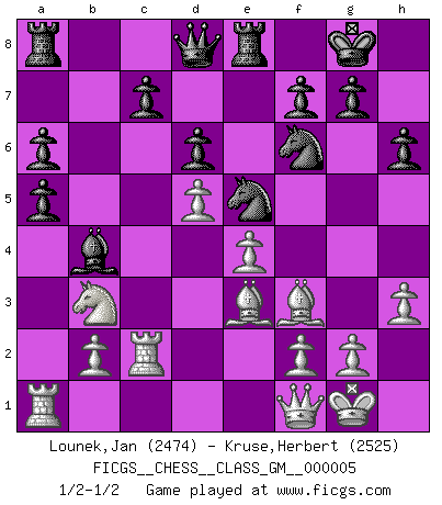 Last move : 1/2-1/2 2021 May 3 1:6:39 [Event "FICGS__CHESS__CLASS_GM__000005"] [Site "FICGS"] [Date "2021.03.16"] [Round "1"] [White "Lounek,Jan"] [Black "Kruse,Herbert"] [Result "1/2-1/2"] [WhiteElo "2474"] [BlackElo "2525"] 1.e4 e5 2.Nf3 Nc6 3.Bb5 Nf6 4.d3 Bc5 5.c3 O-O 6.O-O d6 7.Nbd2 Ne7 8.d4 exd4 9.cxd4 Bb6 10.Re1 Bg4 11.h3 Bh5 12.a4 a6 13.Bf1 Nc6 14.d5 Ne5 15.a5 Bc5 16.Be2 Bxf3 17.Bxf3 b6 18.Nb3 Bb4 19.Re2 bxa5 20.Rc2 Re8 21.Be3 h6 22.Qf1 1/2-1/2 Ruy Lopez : Berlin defense Kingside Castling by player Black (move 5) Kingside Castling by player White (move 6) This chess game ended in a draw. Follow this game move after move (download)If your opponent offers you a draw, try to work out why he thinks he's worse off. (Nigel Short) Nach Morphy wurde nichts neues mehr in der Behandlung offener Positionen gefunden. (Mikhail Moiseyevich Botvinik) Las combinaciones han sido siempre el aspecto más intrigante del Ajedrez. Los Maestros las buscan, el público las aplauden, los críticos las alaban. La razón se debe a que las combinaciones hacen posible que el Ajedrez sea más que un ejercicio matemático con una carencia de vida. Ellas son la poesía del juego, son del Ajedrez lo que la melodía es de la música. Ellas representan el triunfo de la mente sobre la materia. (Reuben Fine) A chaque perte on perd un peu de soi. (Joël Lautier) Computer Science is no more about computers than astronomy is about telescopes. (Edsger W. Dijkstra)