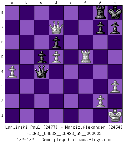 Last move : 1/2-1/2 2021 March 22 17:14:57 [Event "FICGS__CHESS__CLASS_GM__000005"] [Site "FICGS"] [Date "2021.03.16"] [Round "1"] [White "Larwinski,Paul"] [Black "Marciz,Alexander"] [Result "1/2-1/2"] [WhiteElo "2477"] [BlackElo "2454"] 1.e4 c5 2.Nf3 Nc6 3.d4 cxd4 4.Nxd4 Nf6 5.Nc3 e5 6.Ndb5 d6 7.Nd5 Nxd5 8.exd5 Nb8 9.a4 Be7 10.Be2 O-O 11.O-O Nd7 12.Kh1 a6 13.Na3 f5 14.f4 exf4 15.Bxf4 Nc5 16.Nc4 a5 17.h3 b6 18.c3 Ba6 19.b4 Bxc4 20.bxc5 Bxe2 21.Qxe2 bxc5 22.Qe6+ Kh8 23.Rae1 Ra7 24.c4 Rd7 25.Bd2 Bh4 26.Bxa5 Qxa5 27.Qxf5 Rg8 28.Re4 Qd8 29.Rxh4 Qxh4 30.Qxd7 Qxc4 31.Rf5 1/2-1/2 Sicilian : Pelikan (Lasker/Sveshnikov) variation Kingside Castling by player Black (move 10) Kingside Castling by player White (move 11) This chess game ended in a draw. Follow this game move after move (download)The only thing Chess players have in common is Chess. (Lodewijk Prins) Frage: Wie viele Autos haben Sie schon zerstört? - Antwort: Nur zwei. (Loek van Wely) De todos mis libros Rusos, la defensa contiene y difunde el 'calor' mas grande que pudiese verse extraño al observar lo supremamente abstracto que el Ajedrez supuestamente es. (Vladimir Nabokov) Les Echecs ne sont pas pour les âmes timides. Ils requièrent un homme entier, qui ne s'arrête pas aveuglément à ce qui a été déjà établi, mais qui tente individuellement de sonder les profondeurs du jeu. (W. Steinitz) Life is painting a picture, not doing a sum. (Oliver Wendell Holmes, Jr.)