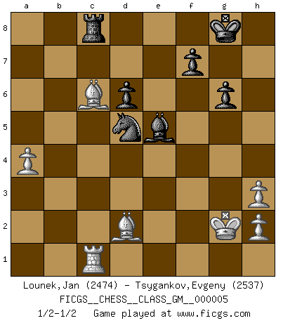 Last move : 1/2-1/2 2021 September 2 16:59:17 [Event "FICGS__CHESS__CLASS_GM__000005"] [Site "FICGS"] [Date "2021.03.16"] [Round "1"] [White "Lounek,Jan"] [Black "Tsygankov,Evgeny"] [Result "1/2-1/2"] [WhiteElo "2474"] [BlackElo "2537"] 1.e4 c5 2.Nf3 d6 3.d4 cxd4 4.Nxd4 Nf6 5.Nc3 a6 6.Be3 e5 7.Nb3 Be6 8.f3 h5 9.Nd5 Bxd5 10.exd5 Nbd7 11.Qd2 g6 12.Be2 Bg7 13.O-O b6 14.c4 O-O 15.Kh1 Re8 16.Rae1 Rb8 17.Bg5 Qc7 18.Bd3 Nh7 19.Be3 Nhf6 20.Qe2 h4 21.Qf2 b5 22.Rc1 bxc4 23.Bxc4 h3 24.gxh3 Qd8 25.Qh4 Nf8 26.Rf2 N8h7 27.Rfc2 Qd7 28.Nd2 Qf5 29.Kg2 e4 30.fxe4 Nxe4 31.Qf4 Qxf4 32.Bxf4 Nxd2 33.Bxd2 Bxb2 34.Rb1 Rec8 35.a4 Nf6 36.Bd3 Rxc2 37.Bxc2 Re8 38.Bd3 Be5 39.Bxa6 Ra8 40.Bb5 Nxd5 41.Bc6 Rc8 42.Rc1 1/2-1/2 Sicilian : Najdorf, Byrne (English) attack Kingside Castling by player White (move 13) Kingside Castling by player Black (move 14) This chess game ended in a draw. Follow this game move after move (download)We must make sure that Chess will not be like a dead language, very interesting, but for a very small group. (Sytze Faber) Wie ich sie so einen nach dem anderen nieder mähte wurde meine Überlegenheit offensichtlich. (José Raúl Capablanca) Algunos sacrificios son sólidos, los demás son míos. (Mikhail Tal) D'abord les bases : Jouez et étudiez, puis étudiez et jouez, ensuite jouez et étudiez, puis étudiez et jouez. Deuxièmement : Donnez toujours le meilleur de vous-même ! (Ken Smith) Vladimir Ras-Putin is still alive... He is also a good actor, I saw him in the Lord of the Rings. (Rodolfo d'Ettorre)