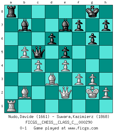 Last move : 0-1 2021 September 26 13:42:4 [Event "FICGS__CHESS__CLASS_C__000290"] [Site "FICGS"] [Date "2021.03.18"] [Round "1"] [White "Nudo,Davide"] [Black "Suwara,Kazimierz"] [Result "0-1"] [WhiteElo "1661"] [BlackElo "1868"] 1.e4 c5 2.Nf3 e6 3.d4 cxd4 4.Nxd4 a6 5.Nc3 b5 6.a3 Bb7 7.Bd3 d6 8.O-O Nf6 9.Qe2 Be7 10.b4 O-O 11.a4 bxa4 12.Rxa4 Nc6 13.Nxc6 Bxc6 14.Rxa6 Rxa6 15.Bxa6 Qa8 16.Bd3 e5 17.b5 Bb7 18.f3 Rc8 19.Bb2 Qa5 20.Ra1 Qc7 21.g3 g6 22.Na4 Nd7 23.c4 Ra8 24.Kg2 Nc5 25.Nxc5 Qxc5 0-1 Sicilian : Kan, 5.Nc3 Kingside Castling by player White (move 8) Kingside Castling by player Black (move 10) Player Black won this chess game. Follow this game move after move (download)The laws of Chess do not permit a free choice: you have to move whether you like it or not. (Emanuel Lasker) Alle Schachspieler sollten auch ein Hobby haben. (Savielly Grigorievitsch Tartakower) Debes de llevar a tu oponente hacia un profundo y obscuro bosque donde 2+2=5, y el camino que conduce a la salida es suficientemente ancho para solamente uno. (Mikhail Tal) Ce qui caractérise les parties de combat, c'est que si le défenseur a constamment de difficiles problèmes à résoudre, l'attaquant doit chercher sans relâche de nouvelles possibilités d'attaque. (Koblentz) Luck never gives; it only lends. (Swedish proverb)