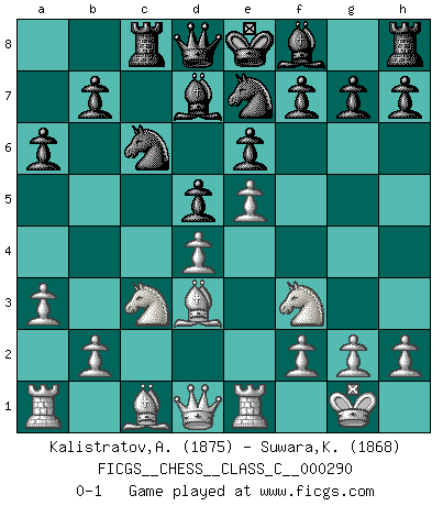 Last move : 0-1 2021 July 14 1:27:57 [Event "FICGS__CHESS__CLASS_C__000290"] [Site "FICGS"] [Date "2021.03.18"] [Round "1"] [White "Kalistratov,Aleksandr"] [Black "Suwara,Kazimierz"] [Result "0-1"] [WhiteElo "1875"] [BlackElo "1868"] 1.e4 c5 2.Nf3 a6 3.c3 e6 4.d4 d5 5.e5 Bd7 6.Bd3 cxd4 7.cxd4 Nc6 8.Nc3 Nh6 9.O-O Ng8 10.a3 Nge7 11.Re1 Rc8 0-1 This chess game has been lost on time (started : 2021.03.18 18:29:39) Sicilian : O'Kelly variation Kingside Castling by player White (move 9) Player Black won this chess game. Follow this game move after move (download)Chess opens and enriches your mind. (Saudin Robovic) Am wohlsten fühle ich mich, wenn ich sehe, wie sich mein Gegner im Todeskampf windet. (Robert James Fischer) Un entendimiento a fondo de las continuaciones típicas del mate, hace de las combinaciones de sacrificio mas complicadas conducirlas a ellas no solo sin dificultad, sino casi de una manera natural. (Siegbert Tarrasch) Il (Jacob Murray) ne joue pas pour le bon coup, mais pour le meilleur. (Eloi Relange) I don't know, I don't care, and it doesn't make any difference. (Albert Einstein)