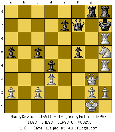 Last move : 1-0 2021 May 23 8:3:38 [Event "FICGS__CHESS__CLASS_C__000290"] [Site "FICGS"] [Date "2021.03.18"] [Round "1"] [White "Nudo,Davide"] [Black "Trigance,Emile"] [Result "1-0"] [WhiteElo "1661"] [BlackElo "1695"] 1.e4 c5 2.Nf3 Nc6 3.Bb5 g6 4.O-O Bg7 5.Re1 Nf6 6.e5 Nd5 7.Nc3 Nc7 8.Bxc6 dxc6 9.Ne4 Ne6 10.d3 O-O 11.Be3 b6 12.Qd2 Nd4 13.Nxd4 cxd4 14.Bh6 Bf5 15.Ng3 Bd7 16.Re4 c5 17.Bxg7 Kxg7 18.Rh4 Rh8 19.Qh6+ Kg8 20.Re1 Qf8 21.Qc1 h6 22.b4 Be6 23.bxc5 bxc5 24.f4 f5 25.exf6 Qxf6 26.f5 gxf5 27.Qf4 a5 28.Nh5 Qf7 29.Qg3+ Kh7 30.Rxe6 Rag8 31.Rxh6+ 1-0 Sicilian : Nimzovich-Rossolimo attack (with ...g6, without ...d6) Kingside Castling by player White (move 4) Kingside Castling by player Black (move 10) Player White won this chess game. Follow this game move after move (download)Chess is like war on a board. (Bobby Fischer) Das Schachspiel ist ein See, in welchem eine Mücke baden und ein Elefant ertrinken kann. (Emanuel Lasker) El ganar no lo es todo... pero el perder es nada. (Mednis) Horreur, mais aussi harmonie suprême : qu'y avait-il en effet au monde en dehors des échecs ? Le brouillard, l'inconnu, le non-être... (Vladimir Nabokov) Perception is reality. (Immanuel Kant)