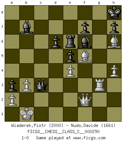 Last move : 1-0 2021 April 30 5:12:14 [Event "FICGS__CHESS__CLASS_C__000290"] [Site "FICGS"] [Date "2021.03.18"] [Round "1"] [White "Wiaderek,Piotr"] [Black "Nudo,Davide"] [Result "1-0"] [WhiteElo "2000"] [BlackElo "1661"] 1.e4 c5 2.Nf3 d6 3.d4 cxd4 4.Nxd4 Nf6 5.Nc3 a6 6.h3 e6 7.g4 Be7 8.Bg2 Nfd7 9.Be3 Qc7 10.g5 Nc6 11.f4 b5 12.Nxc6 Qxc6 13.h4 Bb7 14.Qd4 e5 15.Qd3 Nc5 16.Qd2 Na4 17.Nxa4 bxa4 18.O-O-O a3 19.b3 a5 20.f5 a4 21.Kb1 O-O 22.f6 gxf6 23.gxf6 Bxf6 24.Bh6 axb3 25.cxb3 Rfe8 26.Qf2 Re6 27.Rhg1 Qc3 28.Bh3 Kh8 29.Bf5 Rg8 30.Rxg8+ Kxg8 31.Rg1+ Kh8 32.Rg3 1-0 Sicilian : Najdorf, Adams attack Queenside Castling by player White (move 18) Kingside Castling by player Black (move 21) Player White won this chess game. Follow this game move after move (download)The essence of Chess is thinking about what Chess is. (David Bronstein) Das ganze Leben mit einer Ehefrau ist wie ein Endspiel mit ungleichfarbigen Läufern. (Viktor Kortschnoi) El Jaque al descubierto es el bombardero del tablero. (Reuben Fine) Une platitude souvent récitée à propos des Echecs est qu'une des choses les plus difficiles à réaliser est de gagner une position gagnante. Cela ne manque pas de sens mais, pour ma part, j'ai toujours trouvé plus difficile de gagner une position perdante. (Tim Krabbe) The only sure thing about luck is that it will change. (Wilson Mizner)
