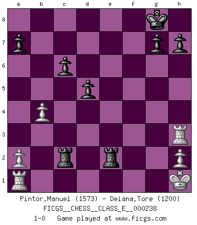 Last move : 1-0 2021 June 24 1:40:7 [Event "FICGS__CHESS__CLASS_E__000238"] [Site "FICGS"] [Date "2021.03.18"] [Round "1"] [White "Pintor,Manuel"] [Black "Deiana,Tore"] [Result "1-0"] [WhiteElo "1573"] [BlackElo "1200"] 1.e4 c5 2.f4 e6 3.Nf3 d5 4.exd5 exd5 5.d4 cxd4 6.Nxd4 Nf6 7.Bb5+ Bd7 8.Bxd7+ Qxd7 9.O-O Be7 10.Nc3 Nc6 11.Kh1 O-O 12.f5 Rfe8 13.Nxc6 bxc6 14.Qf3 Bd6 15.g4 Ne4 16.g5 Nxc3 17.Qxc3 Re2 18.Bf4 Rae8 19.Qg3 Bf8 20.g6 Qxf5 21.gxf7+ Qxf7 22.Bd6 Bxd6 23.Qxd6 Qe6 24.Qxe6+ R8xe6 25.Rf3 Rxc2 26.b4 R6e2 27.Rh3 1-0 Sicilian : Grand Prix attack Kingside Castling by player White (move 9) Kingside Castling by player Black (move 11) Player White won this chess game. Follow this game move after move (download)Fischer is completely natural. He plays no roles. He's like a child. Very, very simple. (Zita Rajcsanyi) Als ich elf wurde, wurde ich einfach gut. (Robert James Fischer) Fischer no está bajo la obligación de nadie. (Joseph Platz) Les échecs, c'est la lutte contre l'erreur. (Johannes Zukertort) The smarter you play, the luckier you'll be. (Mark Pilarski)