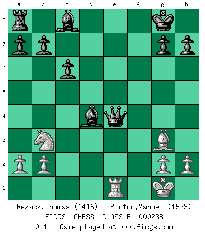 Last move : 0-1 2021 April 21 17:26:6 [Event "FICGS__CHESS__CLASS_E__000238"] [Site "FICGS"] [Date "2021.03.18"] [Round "1"] [White "Rezack,Thomas"] [Black "Pintor,Manuel"] [Result "0-1"] [WhiteElo "1416"] [BlackElo "1573"] 1.e4 e5 2.Nf3 Nc6 3.d4 exd4 4.Nxd4 Qf6 5.Be3 Bc5 6.c3 d6 7.f3 Ne5 8.Nd2 Qh4+ 9.Bf2 Qh6 10.N2b3 Bb6 11.Bb5+ c6 12.Be2 Qg5 13.Bg3 Nf6 14.O-O O-O 15.f4 Qg6 16.fxe5 dxe5 17.Qc2 exd4 18.cxd4 Nxe4 19.Bd3 f5 20.Bxe4 fxe4 21.Rxf8+ Kxf8 22.Rf1+ Kg8 23.Qxe4 Qxe4 24.Re1 Bxd4+ 0-1 Scotch game Kingside Castling by player White (move 14) Kingside Castling by player Black (move 14) Player Black won this chess game. Follow this game move after move (download)As one by one I mowed them down, my superiority soon became apparent. (Jose Capablanca) Jeder Fehler erscheint unglaublich dumm, wenn andre ihn begehen. (Georg Christoph Lichtenberg) Ser exitoso en el Ajedrez te permite descubrir tu propia personalidad. Eso es lo que deseo para los niños de mi clase. (Saudin Robovic) Les Cavaliers se révèlent fort utiles dans les positions fermées. D'habitude, les Fous sont un peu plus forts que les Cavaliers dans les positions ouvertes. Qu'on le veuille ou non, il restera toujours des exceptions ! The worth of a book is to be measured by what you can carry away from it. (James Bryce)