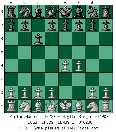 Last move : 1-0 2021 April 29 7:52:2 [Event "FICGS__CHESS__CLASS_E__000238"] [Site "FICGS"] [Date "2021.03.18"] [Round "1"] [White "Pintor,Manuel"] [Black "Niglio,Biagio"] [Result "1-0"] [WhiteElo "1573"] [BlackElo "1490"] 1.e4 c6 2.f4 1-0 This chess game has been lost on time (started : 2021.03.18 22:29:52) Caro-Kann defense Player White won this chess game. Follow this game move after move (download)Why must I lose to this idiot ? (Aron Nimzovich) Es gibt zwei Arten von Opfern: Korrekte und meine. (Mikhail Nekhemyevich Tal) El Ajedrez es parte de la cultura, y si una cultura esta en decadencia, entonces también el Ajedrez declinará. (Mikhail Botvinnik) Il (Jacob Murray) ne joue pas pour le bon coup, mais pour le meilleur. (Eloi Relange) Control your own destiny or someone else will. (Jack Welch)