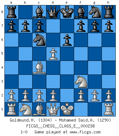 Last move : 1-0 2021 May 8 2:13:24 [Event "FICGS__CHESS__CLASS_E__000238"] [Site "FICGS"] [Date "2021.03.18"] [Round "1"] [White "Goldmund,Heike"] [Black "Mohamed Said,Azaim"] [Result "1-0"] [WhiteElo "1304"] [BlackElo "1290"] 1.e4 e6 2.Nf3 Nc6 3.Bc4 d5 4.exd5 1-0 This chess game has been lost on time (started : 2021.03.18 22:29:52) French defense Player White won this chess game. Follow this game move after move (download)Dazzling combinations are for the many, shifting wood is for the few. (Georg Kieninger) Schach ist das Spiel, das die Verrückten gesund hält. (Albert Einstein) El Ajedrez, como cualquier otra actividad creativa, puede existir solo a través de méritos combinados de aquellos que tienen talento creativo y de aquellos que tienen la habilidad de organizar un trabajo creativo. (Mikhail Botvinnik) Il n'y a pas eu de défaite parce que je ne crois pas que cet ordinateur ait jamais existé. IBM a triché en refusant d'imprimer les modes de recherche de la machine. C'est évident, pendant le match, des coups décisifs ont été joués par des êtres humains. Aujourd'hui, les meilleurs spécialistes en informatique ne peuvent toujours pas expliquer comment Deep-Blue a pu jouer contre la logique des ordinateurs. IBM a gagné une guerre de communication, mais ils sont incapables de prouver que l'ordinateur a gagné tout seul. (Garry Kasparov) It is the aim of the modern school, not to treat every position according to one general law, but according to the principle inherent in the position. (Richard Reti)