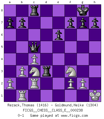 Last move : 0-1 2021 June 3 16:42:9 [Event "FICGS__CHESS__CLASS_E__000238"] [Site "FICGS"] [Date "2021.03.18"] [Round "1"] [White "Rezack,Thomas"] [Black "Goldmund,Heike"] [Result "0-1"] [WhiteElo "1416"] [BlackElo "1304"] 1.e4 d5 2.exd5 Qxd5 3.Nc3 Qa5 4.d4 Nf6 5.Bd2 c6 6.Nf3 Bg4 7.Be2 e6 8.O-O Qc7 9.Be3 Bd6 10.Nd2 Bxe2 11.Nxe2 Bxh2+ 12.Kh1 Bf4 13.Bxf4 Qb6 14.Rb1 O-O 15.Bd6 Rd8 16.Be5 Nbd7 17.Nc4 Qb5 18.b3 Nxe5 19.Nxe5 c5 20.c4 Qb6 21.Qc2 cxd4 22.Rfd1 Rac8 23.Rd3 Nd5 24.Qb2 Nb4 25.Rd2 Qc5 26.Nf3 d3 27.Nc3 Nc2 28.Qxc2 dxc2 29.Rxc2 Rd3 0-1 Scandinavian (centre counter) defense Kingside Castling by player White (move 8) Kingside Castling by player Black (move 14) Player Black won this chess game. Follow this game move after move (download)Play the opening like a book, the middle game like a magician, and the endgame like a machine. (Spielmann) Ich hatte Zahnschmerzen im ersten Spiel. In der zweiten Partie tat mir der Kopf weh. In der dritten war es eine Rheuma-Attacke und während der vierten fühlte ich mich nicht gut. Und in der fünften? Nun, man muss doch nicht jedes Spiel gewinnen, oder? (Savielly Grigorievitsch Tartakower) No hay precio que sea tan grande por la cabellera del Rey enemigo. (Koblentz) Mon pion favori sur ma case favorite ! Bronstein en parlant d'un coup de pion en h5 quand il avait les Noirs. You can think I'm wrong, but that's no reason to quit thinking. (Gregory House, House M.D.)