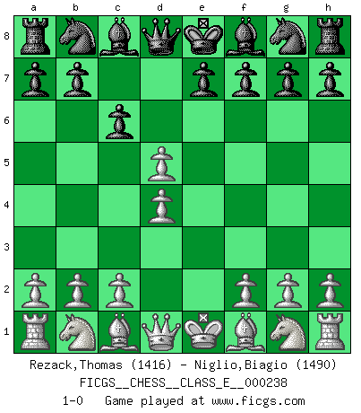 Last move : 1-0 2021 April 30 13:8:13 [Event "FICGS__CHESS__CLASS_E__000238"] [Site "FICGS"] [Date "2021.03.18"] [Round "1"] [White "Rezack,Thomas"] [Black "Niglio,Biagio"] [Result "1-0"] [WhiteElo "1416"] [BlackElo "1490"] 1.e4 c6 2.d4 d5 3.exd5 1-0 This chess game has been lost on time (started : 2021.03.18 22:29:52) Caro-Kann : Exchange variation Player White won this chess game. Follow this game move after move (download)I love all positions. Give me a difficult positional game, I will play it. But totally won positions, I cannot stand them. (Hein Donner) Sehr viele beherrschen heutzutage das große Einmalseins des Schachspiels und kennen sogar dessen Logarithmentafeln auswendig - deshalb sollte man hin und wieder zu beweisen trachten, dass zwei mal zwei auch fünf sein kann. (Mikhail Nekhemyevich Tal) El sobresalir en el Ajedrez es un signo de una mente intrigante. (Sir Arthur Conan Doyle) D'abord les bases : Jouez et étudiez, puis étudiez et jouez, ensuite jouez et étudiez, puis étudiez et jouez. Deuxièmement : Donnez toujours le meilleur de vous-même ! (Ken Smith) Computers are like Old Testament gods; lots of rules and no mercy. (Joseph Campbell)