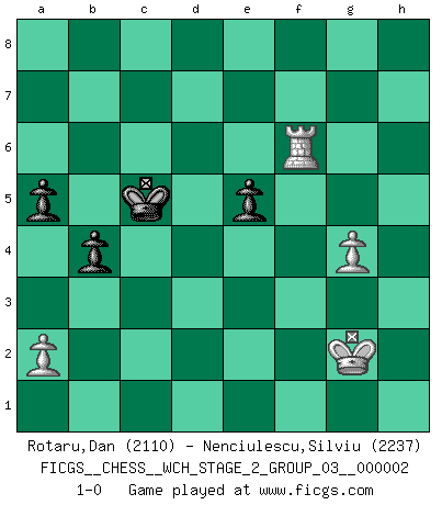 Last move : 1-0 2007 November 1 21:15:17 [Event "FICGS__CHESS__WCH_STAGE_2_GROUP_03__000002"] [Site "FICGS"] [Date "2007.07.11"] [Round "1"] [White "Rotaru,Dan"] [Black "Nenciulescu,Silviu"] [Result "1-0"] [WhiteElo "2110"] [BlackElo "2237"] 1.e4 c5 2.Nf3 d6 3.Bb5+ Bd7 4.Bxd7+ Nxd7 5.O-O Ngf6 6.Qe2 e6 7.b3 Be7 8.Bb2 O-O 9.c4 a6 10.d4 cxd4 11.Nxd4 Qb6 12.Rd1 Nc5 13.Nc3 Rfe8 14.Rd2 Bf8 15.Rad1 Be7 16.Kh1 Qc7 17.f4 d5 18.cxd5 Qxf4 19.g3 Qg4 20.d6 e5 21.Qxg4 Nxg4 22.Nf5 Bg5 23.Re2 g6 24.Ne7+ Bxe7 25.dxe7 Rxe7 26.b4 Nd7 27.Nd5 Kf8 28.Nxe7 Kxe7 29.Kg2 Rc8 30.Rc1 Rxc1 31.Bxc1 f5 32.exf5 gxf5 33.Bg5+ Ke6 34.Rc2 Kd6 35.h3 Ngf6 36.Bxf6 Nxf6 37.Rc8 Nd5 38.Rh8 Nxb4 39.Rxh7 b6 40.h4 Nd5 41.Rb7 Kc6 42.Rg7 Kd6 43.h5 Nf6 44.h6 b5 45.h7 Nxh7 46.Rxh7 a5 47.Rb7 Kc6 48.Rf7 b4 49.Rxf5 Kd6 50.Rf6+ Kc5 51.g4 1-0 Sicilian : Canal-Sokolsky attack, 3...Bd7 Kingside Castling by player White (move 5) Kingside Castling by player Black (move 8) 10 pieces endgame at move 45 : White KRPP , Black KNPPPP WHITE : King + 1 Rook 2 Pawns BLACK : King + 1 Knight 4 Pawns 9 pieces endgame at move 46 : White KRPP , Black KPPPP WHITE : King + 1 Rook 2 Pawns BLACK : King + 4 Pawns 8 pieces endgame at move 49 : White KRPP , Black KPPP WHITE : King + 1 Rook 2 Pawns BLACK : King + 3 Pawns Player White won this chess game. Follow this game move after move (download)The Pin is mightier than the sword. (Fred Reinfeld) Das Schach hält seine Meister in eigenen Banden, Fesseln; auf vielerlei Weise formt es ihren Geist, so dass die innere Freiheit selbst des Stärksten beeinflusst wird. (Albert Einstein) El Ajedrez, como cualquier otra actividad creativa, puede existir solo a través de méritos combinados de aquellos que tienen talento creativo y de aquellos que tienen la habilidad de organizar un trabajo creativo. (Mikhail Botvinnik) Il n'y a pas de prix trop élevé au scalp de l'ennemi. (Koblentz) I take risks, sometimes patients die, but not taking risks causes more patients to die. So I guess my biggest problem is I've been cursed with the ability to do the math. (Gregory House, House M.D.)