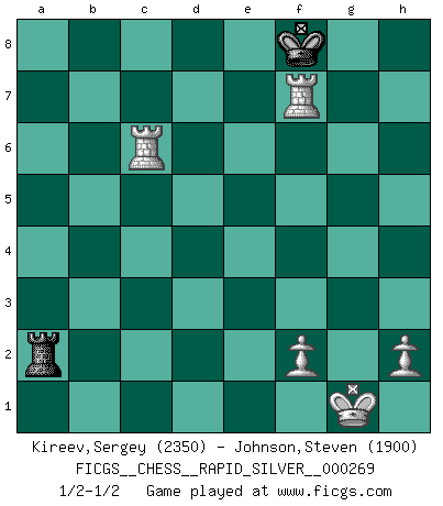 Last move : 1/2-1/2 2021 May 23 0:6:40 [Event "FICGS__CHESS__RAPID_SILVER__000269"] [Site "FICGS"] [Date "2021.03.24"] [Round "2"] [White "Kireev,Sergey"] [Black "Johnson,Steven"] [Result "1/2-1/2"] [WhiteElo "2350"] [BlackElo "1900"] 1.d4 d5 2.c4 Nf6 3.cxd5 c5 4.e4 Nxe4 5.dxc5 Qa5+ 6.Bd2 Nxd2 7.Qxd2 Qxd2+ 8.Nxd2 g6 9.Rc1 Bh6 10.Bb5+ Nd7 11.c6 bxc6 12.dxc6 Nb6 13.Ngf3 O-O 14.O-O a6 15.Be2 Bg4 16.Rc2 Bf5 17.Rc5 Na4 18.Re5 Ra7 19.g4 Bxg4 20.Re4 Bxf3 21.Nxf3 Nb6 22.Ne5 Bg7 23.Bf3 Rd8 24.Rfe1 a5 25.R4e3 a4 26.Re4 Nd5 27.Nd7 e6 28.Rc4 Rc7 29.Re2 Bf8 30.Rd2 Rdc8 31.Nxf8 Kxf8 32.Bxd5 exd5 33.Rxa4 Rxc6 34.Rxd5 Rc2 35.Rd7 Rxb2 36.R4a7 Kg8 37.Rxf7 Rxa2 38.Rg7+ Kf8 39.Raf7+ Ke8 40.Rb7 Kf8 41.Rxh7 Kg8 42.Rbg7+ Kf8 43.Rxg6 Rc4 44.Rb7 Rf4 45.Rc6 Rf7 46.Rxf7+ 1/2-1/2 QGD : Marshall defense Kingside Castling by player Black (move 13) Kingside Castling by player White (move 14) 10 pieces endgame at move 37 : White KRRPP , Black KRRPP WHITE : King + 2 Rooks 2 Pawns BLACK : King + 2 Rooks 2 Pawns 9 pieces endgame at move 41 : White KRRPP , Black KRRP WHITE : King + 2 Rooks 2 Pawns BLACK : King + 2 Rooks 1 Pawn 8 pieces endgame at move 43 : White KRRPP , Black KRR WHITE : King + 2 Rooks 2 Pawns BLACK : King + 2 Rooks 7 pieces endgame at move 46 : White KRRPP , Black KR WHITE : King + 2 Rooks 2 Pawns BLACK : King + 1 Rook This chess game ended in a draw. Follow this game move after move (download)I like the moment when I break a man's ego. (Bobby Fischer) Im Internet Chess Club betrug mein Rating vorübergehend 3350 ELO-Punkte. (Sergej Karjakin) Los finales de Peón son del Ajedrez lo que el cesped es del Golf. (Cecil Purdy) Le jeu d'échecs fait naître et fortifie en nous plusieurs qualités précieuses dans le cours de l'existence, telles que la prévoyance, la circonspection, la prudence, et la persévérance. (Benjamin Franklin - 1783, la morale des échecs) Do you know these so called Volunteers don't even get paid! (Simpsons)