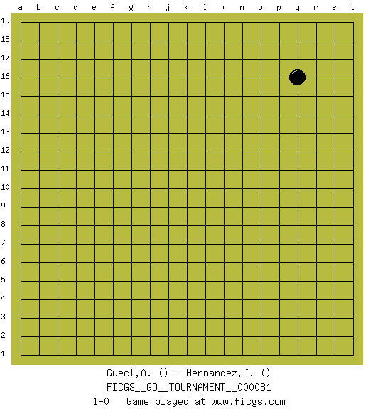 Last move : 1-0 2021 April 25 8:39:15 [Event "FICGS__GO__TOURNAMENT__000081"] [Site "FICGS"] [Date "2021.03.24"] [Round "1"] [Black "Gueci,Alberto"] [White "Hernandez,J. Carlos"] [Result "1-0"] 1.q16 1-0 This go game has been lost on time (started : 2021.03.24 18:32:57) Here are the names of the openings (joseki) played in the four corners : Player Black won this Go (weiqi, baduk) game. Follow this game move after move (download)Only amateurs try to come up with fancy moves. (Anonymous) A mistake is only a mistake if you let it happen twice. Otherwise it is a learning experience. (Daniel Parmet)
