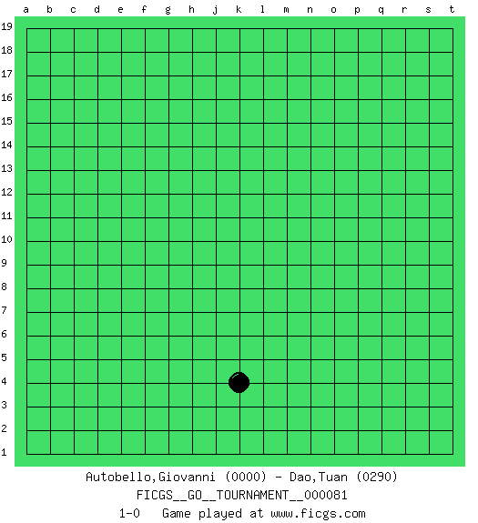 Last move : 1-0 2021 April 24 7:23:3 [Event "FICGS__GO__TOURNAMENT__000081"] [Site "FICGS"] [Date "2021.03.24"] [Round "1"] [Black "Autobello,Giovanni"] [White "Dao,Tuan"] [Result "1-0"] [Rating 1 "0000"] [Rating 2 "0290"] 1.k4 1-0 This go game has been lost on time (started : 2021.03.24 18:32:57) Here are the names of the openings (joseki) played in the four corners : Player Black won this Go (weiqi, baduk) game. Follow this game move after move (download)Don't make dango's. (Anonymous) How many people work in NATO Headquarters ? - About half of them. (Dirk Stikker, NATO general secretary)