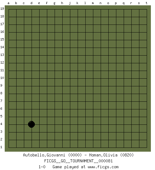 Last move : 1-0 2021 April 24 7:23:3 [Event "FICGS__GO__TOURNAMENT__000081"] [Site "FICGS"] [Date "2021.03.24"] [Round "1"] [Black "Autobello,Giovanni"] [White "Homan,Olivia"] [Result "1-0"] [Rating 1 "0000"] [Rating 2 "0820"] 1.d4 1-0 This go game has been lost on time (started : 2021.03.24 18:32:57) Here are the names of the openings (joseki) played in the four corners : Corner d4 : d4 1-0 Hoshi (Hwajeom, Seongjeom, Xingwei`) 4-4 Point. The star or hoshi (4-4) point, emphasizing influence at the potential expense of territory. Player Black won this Go (weiqi, baduk) game. Follow this game move after move (download)The poor player plays the opponent's game for him. (Anonymous) The faster the computer, the slower the brain. (Thibault de Vassal)