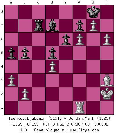 Last move : 1-0 2007 September 27 16:49:26 [Event "FICGS__CHESS__WCH_STAGE_2_GROUP_03__000002"] [Site "FICGS"] [Date "2007.07.11"] [Round "1"] [White "Tsenkov,Ljubomir"] [Black "Jordan,Mark"] [Result "1-0"] [WhiteElo "2191"] [BlackElo "1923"] 1.e4 e6 2.d4 d5 3.Nc3 Nf6 4.e5 Nfd7 5.f4 c5 6.Nf3 Nc6 7.Be3 cxd4 8.Nxd4 Bc5 9.Qd2 O-O 10.g3 a6 11.Bg2 Nxd4 12.Bxd4 b5 13.Ne2 Qc7 14.O-O Bb7 15.c3 h6 16.Rae1 Rac8 17.Bxc5 Nxc5 18.Nd4 Ne4 19.Qe3 Rfe8 20.Rd1 Qc5 21.a3 Qe7 22.h3 Rc4 23.Kh2 Qc7 24.Qe2 Ra4 25.h4 Rc8 26.g4 g6 27.h5 g5 28.Qe3 gxf4 29.Qxf4 Ng5 30.Qe3 Qb8 31.Rf6 Ne4 32.Qf4 Nxf6 33.Qxf6 Qc7 34.Rf1 Re8 35.Bh3 Rxd4 36.cxd4 Qe7 37.Qxh6 Qh4 38.Qf4 Re7 39.Qf6 Qxf6 40.exf6 Rc7 41.g5 Bc8 42.g6 a5 43.g7 Bd7 44.h6 1-0 Comment by player 2 : Mark Jordan : Just curious, where do you think I went wrong and did you use any computer assistance? I did. Maybe 22... Rc4? was bad? French : Steinitz, Boleslavsky variation Kingside Castling by player Black (move 9) Kingside Castling by player White (move 14) Player White won this chess game. Follow this game move after move (download)There are two types of sacrifices: correct ones and mine. (Mikhail Tal) Im Schach nämlich geht es darum, daß Ich des Gegners klein zu kriegen, sein Ego zu zerbrechen und zu zermahlen, seine Selbstachtung zu zertreten und zu verscharren und seine ganze mißachtenswerte sogenannte Persönlichkeit ein für alle Mal tot zu hacken und zu zerstampfen und dadurch die menschliche Gesellschaft von einer stinkenden Pestbeule zu befreien. Es ist ein königliches Spiel. (Robert James Fischer) Hoy en día, si tu no eres un Gran Maestro a los 14 años, es mejor que lo olvides. (Anand Viswanathan) On croit qu'il y a plus de mauvais joueurs que de bons joueurs, c'est faux : Il y a autant de joueurs qui gagnent que de joueurs qui perdent. (Philippe Geluck) Opportunities multiply as they are seized. (Sun Tzu)