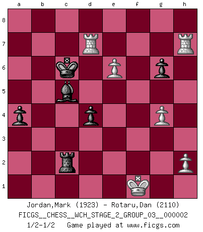 Last move : 1/2-1/2 2007 October 21 20:6:44 [Event "FICGS__CHESS__WCH_STAGE_2_GROUP_03__000002"] [Site "FICGS"] [Date "2007.07.11"] [Round "1"] [White "Jordan,Mark"] [Black "Rotaru,Dan"] [Result "1/2-1/2"] [WhiteElo "1923"] [BlackElo "2110"] 1.e4 c5 2.Nf3 e6 3.d4 cxd4 4.Nxd4 Nc6 5.Nc3 Qc7 6.Be2 a6 7.O-O Nf6 8.Be3 Bb4 9.Na4 Be7 10.Nxc6 bxc6 11.Nb6 Rb8 12.Nxc8 Qxc8 13.Bd4 c5 14.Be5 Rb6 15.Qd3 d6 16.Bc3 O-O 17.b3 d5 18.e5 Nd7 19.Qg3 Rc6 20.Rab1 c4 21.bxc4 Nb6 22.Bd2 Nxc4 23.Bh6 g6 24.Bxf8 Bxf8 25.Bxc4 Rxc4 26.c3 a5 27.Qe3 Qc7 28.Rfe1 Rxc3 29.Rec1 Rxe3 30.Rxc7 Rxe5 31.f4 Rf5 32.g3 Bb4 33.Kg2 d4 34.Rd7 Rc5 35.Rb2 Kg7 36.g4 e5 37.a3 Bxa3 38.R2b7 Kf6 39.Rxf7+ Ke6 40.Rbe7+ Kd6 41.Rd7+ Kc6 42.Rxh7 Rc2+ 43.Kf1 Bc5 44.fxe5 a4 45.e6 1/2-1/2 Sicilian : Taimanov (Bastrikov) variation Kingside Castling by player White (move 7) Kingside Castling by player Black (move 16) This chess game ended in a draw. Follow this game move after move (download)When asked, -How is that you pick better moves than your opponents?, I responded: I'm very glad you asked me that, because, as it happens, there is a very simple answer. I think up my own moves, and I make my opponent think up his. (Alexander Alekhine) Ich trinke, ich rauche, ich spiele, ich liebe Frauen aber Fernschach ist ein Laster, das ich nicht habe. (Mikhail Nekhemyevich Tal) ¿Quién es tu oponente esta tarde? Esta tarde mi oponente son las piezas negras. (Akiba Rubinstein) Il vaut mieux sacrifier les pièces de l'adversaire. (Xavier Tartacover) Think like a man of action, act like a man of thought. (Henri Louis Bergson)