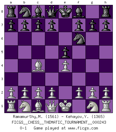 Last move : 0-1 2021 May 5 6:15:48 [Event "FICGS__CHESS__THEMATIC_TOURNAMENT__000243"] [Site "FICGS"] [Date "2021.03.25"] [Round "1"] [White "Ramamurthy,Murali"] [Black "Kehayov,Yulian"] [Result "0-1"] [WhiteElo "1561"] [BlackElo "1365"] 1.e4 e5 2.Bc4 Nf6 0-1 This chess game has been lost on time (started : 2021.03.25 18:32:5) Bishop's Opening : Berlin defense Player Black won this chess game. Follow this game move after move (download)When in doubt... play Chess ! (Tevis) Gewinnen beim Schach fördert das Selbstvertrauen. Beim Sex spüre ich sowas nicht... (Garry Kasparov) a manera como él juega al Ajedrez, demuestra la completa naturaleza de un hombre. (Stanley Ellin) Je fais ceci parce que dans cinquante coups j'obtiendrai cela; je m'appelle Mikhail Moisevitch Botvinnik. (Botvinnik) I live to kill Traxler counterattack. (Ilmars Cirulis)