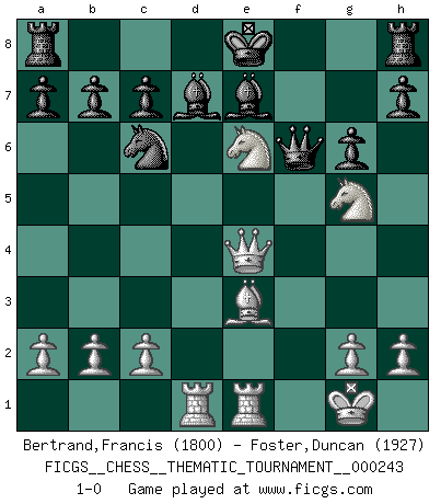 Last move : 1-0 2021 April 13 23:19:32 [Event "FICGS__CHESS__THEMATIC_TOURNAMENT__000243"] [Site "FICGS"] [Date "2021.03.25"] [Round "1"] [White "Bertrand,Francis"] [Black "Foster,Duncan"] [Result "1-0"] [WhiteElo "1800"] [BlackElo "1927"] 1.e4 e5 2.Bc4 f5 3.d4 exd4 4.Nh3 Qe7 5.O-O fxe4 6.Nd2 e3 7.fxe3 dxe3 8.Re1 d5 9.Bxd5 Nf6 10.Nf3 Nxd5 11.Qxd5 Qf7 12.Qe4+ Be7 13.Nhg5 Qf6 14.Bxe3 Nc6 15.Nd4 Bd7 16.Nde6 g6 17.Rad1 1-0 Bishop's Opening : Calabrese counter-gambit Kingside Castling by player White (move 5) Player White won this chess game. Follow this game move after move (download)What is the difference between chess and football? Everybody understands football, but nobody plays it. Everybody plays chess, but nobody understands it. Everything is relative. (Vladimir Kramnik) Weshalb minderdergeübte Spieler mit g2-g4 beginnen? Die betreffenden sind unschlüssig, ob sie nun rechts (h4) oder links (f4) beginnen sollen, und in ihrer Ratlosigkeit entschliessen sie sich nach guter Bürgerart dazu, den goldenen Mittelweg zu wählen. (Aaron Nimzowitsch) En el Ajedrez, cuando menos, el valiente hereda la tierra. (Edmar Mednis) Aidez vos pièces, elles vous aideront. (Paul Morphy) You must have a dream in order to have it come true. (A.P.J. Kalam)