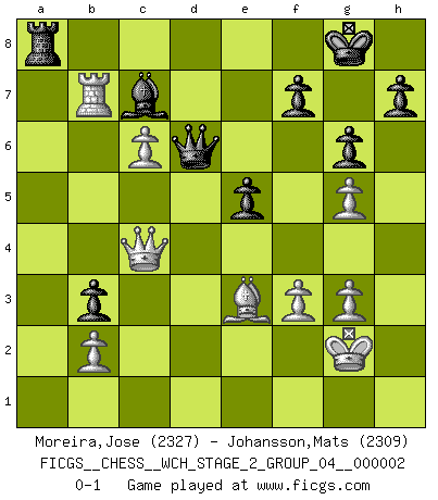 Last move : 0-1 2007 November 29 19:56:39 [Event "FICGS__CHESS__WCH_STAGE_2_GROUP_04__000002"] [Site "FICGS"] [Date "2007.07.11"] [Round "1"] [White "Moreira,Jose"] [Black "Johansson,Mats"] [Result "0-1"] [WhiteElo "2327"] [BlackElo "2309"] 1.e4 c5 2.Nf3 d6 3.d4 cxd4 4.Nxd4 Nf6 5.Nc3 a6 6.Be3 e5 7.Nb3 Be6 8.f3 Nbd7 9.g4 b5 10.g5 b4 11.Ne2 Nh5 12.Qd2 a5 13.Ng3 Nxg3 14.hxg3 a4 15.Nc1 Qa5 16.Nd3 d5 17.exd5 Qxd5 18.Kf2 Rc8 19.Rh4 Bf5 20.Be2 b3 21.c4 Qe6 22.axb3 axb3 23.Ra7 Be7 24.Nb4 Nc5 25.Nd5 Bd6 26.Nb6 Rb8 27.Na4 Nxa4 28.Rxa4 O-O 29.c5 Bc7 30.Ra7 Rfd8 31.Qc3 Qe7 32.Rb4 Be6 33.Bc4 Bxc4 34.Rxb8 Rxb8 35.Qxc4 Qd7 36.Qe4 Rd8 37.Kg2 Rb8 38.c6 Qd6 39.Rb7 Ra8 40.Qc4 g6 0-1 This chess game has been lost on time (started : 2007.07.11 18:39:4) Sicilian : Najdorf, Byrne (English) attack Kingside Castling by player Black (move 28) Player Black won this chess game. Follow this game move after move (download)You know you're going to lose. Even when I was ahead I knew I was going to lose. - On playing against Fischer. (Andrew Soltis) Ich bin es gewohnt, das die Jugend mir überhaupt keinen Respekt entgegenbringt. (Alexander Morozewich) El tablero es el mundo, las piezas es el fenomeno del universo, las reglas del juego son lo que llamamos leyes de la naturaleza y el jugador del lado opuesto, se encuentra oculto a nuestra vista. (Thomas Huxley) Aux échecs, l'amour-propre est satisfait quand on remporte la victoire, mais il n'y a pas de honte à être battu. (Benjamin Franklin) There are two types of people in this world, good and bad. The good sleep better, but the bad seem to enjoy the waking hours much more. (Woody Allen)