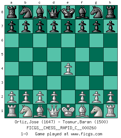 Last move : 1-0 2021 May 2 2:9:31 [Event "FICGS__CHESS__RAPID_C__000260"] [Site "FICGS"] [Date "2021.03.26"] [Round "1"] [White "Ortiz,Jose"] [Black "Tosmur,Baran"] [Result "1-0"] [WhiteElo "1647"] [BlackElo "1500"] 1.e4 1-0 This chess game has been lost on time (started : 2021.03.26 1:45:11) King's pawn Opening Player White won this chess game. Follow this game move after move (download)Chess is played with the mind and not with the hands ! (Renaud and Kahn) Das Schachspiel ist ein See, in welchem eine Mücke baden und ein Elefant ertrinken kann. (Emanuel Lasker) El ganar no lo es todo... pero el perder es nada. (Mednis) Horreur, mais aussi harmonie suprême : qu'y avait-il en effet au monde en dehors des échecs ? Le brouillard, l'inconnu, le non-être... (Vladimir Nabokov) Man with more than one clock never knows what time it is. (Chinese thought)