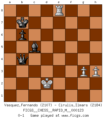 Last move : 0-1 2021 August 22 20:11:21 [Event "FICGS__CHESS__RAPID_M__000123"] [Site "FICGS"] [Date "2021.03.29"] [Round "1"] [White "Vasquez,Fernando"] [Black "Cirulis,Ilmars"] [Result "0-1"] [WhiteElo "2107"] [BlackElo "2184"] 1.e4 c5 2.c3 Nf6 3.e5 Nd5 4.d4 cxd4 5.Nf3 Nc6 6.cxd4 d6 7.Bc4 Nb6 8.Bb5 dxe5 9.Nxe5 Bd7 10.Nxd7 Qxd7 11.O-O e6 12.Nc3 a6 13.Bxc6 Qxc6 14.Be3 Nd5 15.Qg4 Nxe3 16.fxe3 f5 17.Qg3 Qd7 18.d5 Bd6 19.dxe6 Qxe6 20.Qxg7 Qxe3+ 21.Kh1 O-O-O 22.Rae1 Qb6 23.Nd5 Qb5 24.Rxf5 Kb8 25.Qf6 h5 26.Ref1 Qa4 27.a3 h4 28.h3 Rhe8 29.Qg5 Qb3 30.Qxh4 Rh8 31.Qg4 Qxb2 32.Qf3 Rc8 33.a4 Rc1 34.Ne3 Rc3 35.Rf6 Bc7 36.Re6 Rd8 37.Re1 Ka7 38.Re4 R8d3 39.Qf1 a5 40.Ng4 Qb3 41.Rb1 Qd5 42.Rbe1 Rd1 43.Nf2 Rd2 44.Ng4 Ra2 45.R4e3 R3c2 46.Re4 Bb6 47.R4e2 Rxe2 48.Rxe2 Ra3 49.Nf2 Rxa4 50.Re1 Ra3 51.Ne4 a4 52.Re2 Rb3 53.Qa1 a3 54.Ra2 Bc5 55.Qc1 Be7 56.Re2 Bb4 57.Qg1+ Ka8 58.Rc2 Kb8 59.Qh2+ Ka7 60.Qg1+ b6 61.Re2 Rd3 62.Qf2 Rd4 63.Qf4 Qc4 64.Qg4 Bd6 65.Re1 Bc7 66.Qf3 a2 67.Qa3+ Qa4 68.Qc1 Rc4 69.Qa1 Qc2 70.Kg1 Kb7 71.Qd1 Rxe4 72.Qd5+ Qc6 73.Qxe4 Qxe4 74.Rxe4 a1Q+ 75.Kf2 Bd6 76.g3 Qc3 77.Ke2 Bc5 78.Re8 Qc4+ 79.Kd2 Qb4+ 0-1 Sicilian : Alapin's variation (2.c3) Kingside Castling by player White (move 11) Queenside Castling by player Black (move 21) 10 pieces endgame at move 73 : White KQRPP , Black KQBPP WHITE : King + 1 Queen 1 Rook 2 Pawns BLACK : King + 1 Queen 1 Bishop 2 Pawns 9 pieces endgame at move 73 : White KRPP , Black KQBPP WHITE : King + 1 Rook 2 Pawns BLACK : King + 1 Queen 1 Bishop 2 Pawns 8 pieces endgame at move 74 : White KRPP , Black KBPP WHITE : King + 1 Rook 2 Pawns BLACK : King + 1 Bishop 2 Pawns Promotion Queen by player Black (move 74) Player Black won this chess game. Follow this game move after move (download)Chess is a cold bath for the mind. (Sir John Simon) Der vorletzte Fehler gewinnt. (Savielly Grigorievitsch Tartakower) Bendita sea la memoria de aquel que dio al mundo este juego inmortal. (A. G. Gardiner) D'abord les bases : Jouez et étudiez, puis étudiez et jouez, ensuite jouez et étudiez, puis étudiez et jouez. Deuxièmement : Donnez toujours le meilleur de vous-même ! (Ken Smith) Home computers are being called upon to perform many new functions, including the consumption of homework formerly eaten by the dog. (Doug Larson)