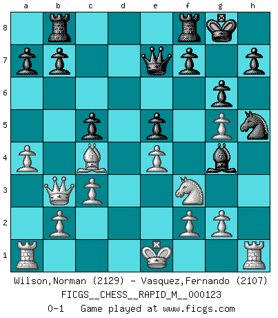Last move : 0-1 2021 May 17 8:15:28 [Event "FICGS__CHESS__RAPID_M__000123"] [Site "FICGS"] [Date "2021.03.29"] [Round "1"] [White "Wilson,Norman"] [Black "Vasquez,Fernando"] [Result "0-1"] [WhiteElo "2129"] [BlackElo "2107"] 1.d4 Nf6 2.c3 g6 3.Bf4 Bg7 4.Nd2 O-O 5.e4 d6 6.Ngf3 Nbd7 7.Be2 Re8 8.Qb3 e5 9.dxe5 Nxe5 10.Bxe5 dxe5 11.Bc4 Qe7 12.Ng5 Rf8 13.Qb4 c5 14.Qb3 Bh6 15.h4 Rb8 16.a4 Bxg5 17.hxg5 Nh5 18.Nf3 Bg4 0-1 Queen's pawn game Kingside Castling by player Black (move 4) Player Black won this chess game. Follow this game move after move (download)I believe that Chess possesses a magic that is also a help in advanced age. A rheumatic knee is forgotten during a game of Chess and other events can seem quite unimportant in comparison with a catastrophe on the chessboard. (Vlastimil Hort) Frage: Wie viele Autos haben Sie schon zerstört? - Antwort: Nur zwei. (Loek van Wely) Los problemas de Ajedrez exigen del compositor las mismas virtudes que caracterizan todo el arte de valor: originalidad, invención, concisión, armonía, complejidad e insinceridad explendida. (Vladimir Nabokov) Un journaliste : 'Vous préférez avoir une dame de plus sur l'échiquier ou au lit ?' Boris Spassky : 'Ca dépend de la position.' The modern world has divided itself into Conservatives and Progressives. The business of Progressives is to go on making mistakes. The business of the Conservatives is to prevent the mistakes from being corrected. (G.K. Chesterton)