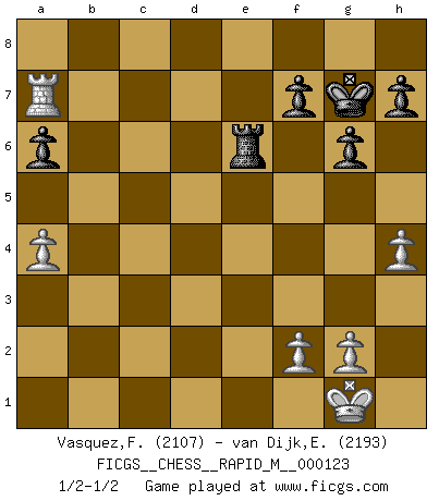 Last move : 1/2-1/2 2021 July 4 4:49:38 [Event "FICGS__CHESS__RAPID_M__000123"] [Site "FICGS"] [Date "2021.03.29"] [Round "1"] [White "Vasquez,Fernando"] [Black "van Dijk,Erik L."] [Result "1/2-1/2"] [WhiteElo "2107"] [BlackElo "2193"] 1.e4 c5 2.c3 Nf6 3.e5 Nd5 4.d4 cxd4 5.Nf3 Nc6 6.cxd4 d6 7.Bc4 Nb6 8.Bb5 Bd7 9.Nc3 dxe5 10.dxe5 g6 11.O-O Bg7 12.Qe2 O-O 13.Rd1 Qc7 14.a4 Nxe5 15.Bxd7 Nxf3+ 16.Qxf3 Nxd7 17.Nd5 Qe5 18.Bf4 Qxb2 19.Rab1 Qa2 20.Rxb7 Nc5 21.Rb5 Ne6 22.Be5 Bxe5 23.Nxe7+ Kg7 24.Rxe5 Qb2 25.R5e1 Rfe8 26.h4 Qf6 27.Qxf6+ Kxf6 28.Nd5+ Kg7 29.Rxe6 Rxe6 30.Nc7 Rae8 31.Nxe8+ Rxe8 32.Rd7 a6 33.Ra7 Re6 1/2-1/2 Sicilian : Alapin's variation (2.c3) Kingside Castling by player White (move 11) Kingside Castling by player Black (move 12) This chess game ended in a draw. Follow this game move after move (download)Chess, like love, like music, has the power to make people happy. (Siegbert Tarrasch) Schach ist ein Reich, wo sich die menschliche Phantasie frei entfalten kann. (David Bronstein) ¿Esta Bobby Fischer algo cuerdo?. (Salo Flohr) La tactique, c'est ce que vous faites quand il y a quelque chose à faire; la stratégie, c'est ce que vous faites quand il n'y a rien à faire. (Savielli Tartacower) If you ain't just a little scared when you enter a casino, you are either very rich or you haven't studied the games enough. (Pappy)