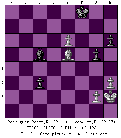 Last move : 1/2-1/2 2021 July 16 23:4:46 [Event "FICGS__CHESS__RAPID_M__000123"] [Site "FICGS"] [Date "2021.03.29"] [Round "1"] [White "Rodriguez Perez,Rene"] [Black "Vasquez,Fernando"] [Result "1/2-1/2"] [WhiteElo "2140"] [BlackElo "2107"] 1.e4 e5 2.Nf3 Nf6 3.Nxe5 d6 4.Nf3 Nxe4 5.d4 d5 6.Bd3 Nc6 7.Nbd2 Nxd2 8.Bxd2 Bd6 9.O-O O-O 10.Ng5 h6 11.Qh5 Nxd4 12.Nh7 Re8 13.Rae1 Re6 14.c3 Nc6 15.Ng5 Rf6 16.f4 Bf5 17.Nxf7 Bc5+ 18.Kh1 Qd7 19.Ne5 Nxe5 20.fxe5 Bg4 21.Qh4 Rxf1+ 22.Rxf1 Rf8 23.Rxf8+ Bxf8 24.h3 Bf5 25.Qd4 Bxd3 26.Qxd3 Qe6 27.Bf4 c5 28.b3 a6 29.a4 c4 30.bxc4 dxc4 31.Qd4 g5 32.Bg3 b5 33.axb5 axb5 34.Qd8 Kg7 35.Qc7+ Kg8 36.Qb7 b4 37.cxb4 c3 38.Qc7 Bxb4 39.Kh2 Qe7 40.Qc4+ Kg7 41.e6 Qc5 42.Qxc5 Bxc5 43.Be5+ Kf8 1/2-1/2 Petrov : Classical attack Kingside Castling by player White (move 9) Kingside Castling by player Black (move 9) 10 pieces endgame at move 42 : White KBPPP , Black KBPPP WHITE : King + 1 Bishop 3 Pawns BLACK : King + 1 Bishop 3 Pawns This chess game ended in a draw. Follow this game move after move (download)Chess is a forcing house where the fruits of character can ripen more fully than in life. (Edward Morgan Foster) Über Karpov: Er war und ist ein Vertreter der russischen Reaktionäre. Das steckt tief in seiner Seele, wehalb ich nicht nett mit ihm umgehen kann. (Viktor Kortschnoi) Por tratar de evitar la pérdida de una pieza, muchas personas han perdido una partida de Ajedrez. (Savielly Tartakover) Les échecs sont un jeu par leur forme, un art par leur essence et une science par sa difficulté d'acquisition. Ils peuvent vous procurer autant de plaisir qu'un bon livre ou une belle musique, mais vous n'aurez une réelle joie que si vous arrivez à bien jouer. (Tigran Petrosian) Art is the triumph over chaos. (John Cheever)