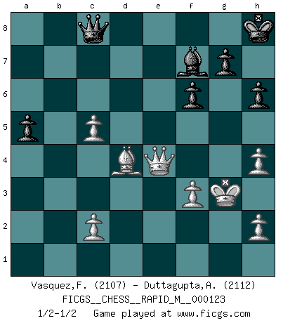 Last move : 1/2-1/2 2021 September 8 10:37:19 [Event "FICGS__CHESS__RAPID_M__000123"] [Site "FICGS"] [Date "2021.03.29"] [Round "1"] [White "Vasquez,Fernando"] [Black "Duttagupta,Aniruddha"] [Result "1/2-1/2"] [WhiteElo "2107"] [BlackElo "2112"] 1.e4 e5 2.Nf3 Nc6 3.d4 exd4 4.Nxd4 Nf6 5.Nxc6 bxc6 6.Bd3 d5 7.Qe2 dxe4 8.Nc3 Bb4 9.Bxe4 O-O 10.Bxc6 Rb8 11.O-O Qd6 12.Bb5 Ng4 13.g3 Bxc3 14.bxc3 Ne5 15.Bf4 Rxb5 16.Qxb5 Nf3+ 17.Kg2 Qe6 18.Rfd1 c6 19.Qa4 Nh4+ 20.Kg1 Qh3 21.gxh4 Qg4+ 22.Kf1 Qf3 23.Rd3 Qh1+ 24.Ke2 Qxa1 25.Qa5 Re8+ 26.Re3 Bg4+ 27.f3 Be6 28.Kf2 Ra8 29.Qc5 Qxa2 30.Qxc6 Rd8 31.Re2 h6 32.Be3 Bc4 33.Qc7 Re8 34.Rd2 a6 35.Qd7 Rf8 36.Bc5 Be6 37.Qd6 Rc8 38.Bd4 f6 39.Re2 Bf7 40.Qd7 Ra8 41.Qg4 Kh8 42.Qf5 Re8 43.Rxe8+ Bxe8 44.Kg3 Qc4 45.Qc5 Qe6 46.c4 Bf7 47.Qd5 Qe8 48.Qe4 Qc8 49.c5 a5 1/2-1/2 Scotch : Schmidt variation Kingside Castling by player Black (move 9) Kingside Castling by player White (move 11) This chess game ended in a draw. Follow this game move after move (download)In Chess, at least, the brave inherit the earth. (Edmar Mednis) Woher wissen wir, daß der Neanderthaler Blindschach gespielt hat? -- Bei Ausgrabungen wurden keine Schachbretter und Figuren gefunden. (Anonymous) Alekhine es un poeta que crea un trabajo de arte de algo que raramente inspiraría a otra persona a mandar una tarjeta postal. (Max Euwe) Le génie consiste à savoir transgresser les règles au moment opportun. (Teichmann) Gambling is the son of avarice and the father of despair. (French proverb)