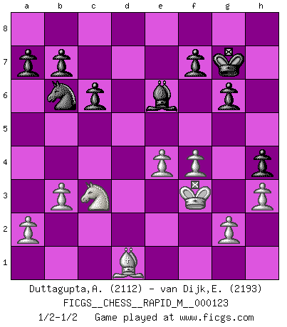 Last move : 1/2-1/2 2021 July 25 3:38:37 [Event "FICGS__CHESS__RAPID_M__000123"] [Site "FICGS"] [Date "2021.03.29"] [Round "1"] [White "Duttagupta,Aniruddha"] [Black "van Dijk,Erik L."] [Result "1/2-1/2"] [WhiteElo "2112"] [BlackElo "2193"] 1.d4 Nf6 2.c4 g6 3.Nc3 d5 4.cxd5 Nxd5 5.Bd2 Bg7 6.e4 Nb6 7.Be3 O-O 8.h3 e5 9.dxe5 Qxd1+ 10.Rxd1 Bxe5 11.Nge2 Nc6 12.f4 Bg7 13.Nd4 Nxd4 14.Bxd4 Rd8 15.Bxg7 Rxd1+ 16.Kxd1 Kxg7 17.Bd3 Be6 18.Ke2 h5 19.Rd1 Rd8 20.Kf3 c6 21.Bc2 Rxd1 22.Bxd1 h4 23.b3 1/2-1/2 King's Indian defense, 3.Nc3 Kingside Castling by player Black (move 7) This chess game ended in a draw. Follow this game move after move (download)Fischer prefers to enter Chess history alone. (Miguel Najdorf) Am wohlsten fühle ich mich, wenn ich sehe, wie sich mein Gegner im Todeskampf windet. (Robert James Fischer) Los problemas de Ajedrez exigen del compositor las mismas virtudes que caracterizan todo el arte de valor: originalidad, invención, concisión, armonía, complejidad e insinceridad explendida. (Vladimir Nabokov) Aidez vos pièces, elles vous aideront. (Paul Morphy) Everything in life is luck. (Donald Trump)
