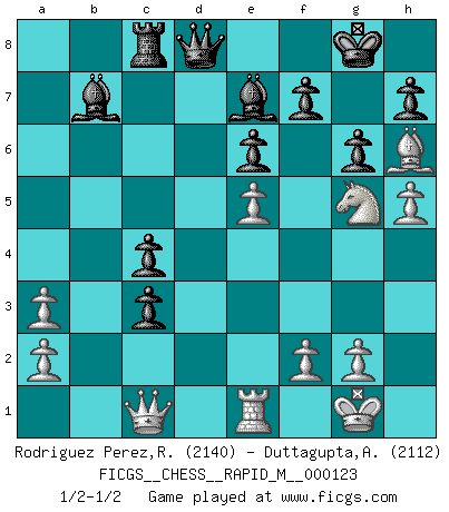 Last move : 1/2-1/2 2021 July 24 13:17:13 [Event "FICGS__CHESS__RAPID_M__000123"] [Site "FICGS"] [Date "2021.03.29"] [Round "1"] [White "Rodriguez Perez,Rene"] [Black "Duttagupta,Aniruddha"] [Result "1/2-1/2"] [WhiteElo "2140"] [BlackElo "2112"] 1.e4 Nf6 2.e5 Nd5 3.d4 d6 4.Nf3 dxe5 5.Nxe5 c6 6.c3 Nd7 7.Nf3 e6 8.Bd3 c5 9.O-O Be7 10.Re1 O-O 11.Bc2 Qc7 12.Qe2 a6 13.Nbd2 b5 14.Qd3 g6 15.Ne4 Bb7 16.Bh6 Rfd8 17.Neg5 Rac8 18.Ne5 Nxe5 19.dxe5 Nb4 20.Qe2 Nxc2 21.Qxc2 c4 22.Rad1 b4 23.h4 a5 24.h5 a4 25.Rxd8+ Qxd8 26.Qc1 a3 27.bxa3 bxc3 1/2-1/2 Alekhine's defense : Modern, Larsen variation Kingside Castling by player White (move 9) Kingside Castling by player Black (move 10) This chess game ended in a draw. Follow this game move after move (download)Chess is no whit inferior to the violin, and we have a large number of professional violinists. (Mikhail Botvinnik) Gewöhnliche Menschen denken nur daran, wie sie ihre Zeit verbringen. Ein intelligenter Mensch versucht, sie auszunutzen. (Arthur Schopenhauer) Por tratar de evitar la pérdida de una pieza, muchas personas han perdido una partida de Ajedrez. (Savielly Tartakover) Votre seul travail dans les ouvertures est d'obtenir un milieu de partie jouable. (Lajos Portish) When it is a question of money, everybody is of the same religion. (Voltaire)