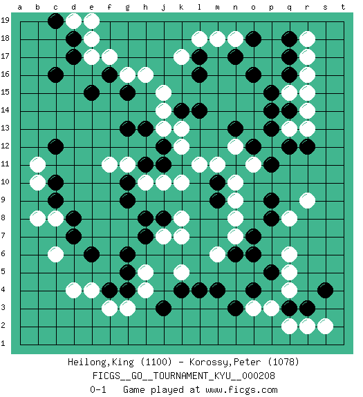 Last move : 0-1 2021 September 11 4:55:23 [Event "FICGS__GO__TOURNAMENT_KYU__000208 "] [Site "FICGS"] [Date "2021.03.30"] [Round "1"] [Black "Heilong,King "] [White "Korossy,Peter "] [Result "0-1"] [Rating 1 "1100"] [Rating 2 "1078"] 1.q16 d4 2.c16 e17 3.e15 g16 4.c12 q4 5.o4 o3 6.n3 p3 7.m4 q6 8.p5 q5 9.j3 f3 10.g4 g3 11.f4 e4 12.e6 r14 13.q14 q13 14.p13 q15 15.p14 r16 16.p15 r15 17.q12 r13 18.r12 r9 19.q17 r17 20.q18 r18 21.o16 k17 22.l16 m18 23.n17 n18 24.o18 j15 25.k14 k10 26.p9 q8 27.p8 n10 28.m10 m11 29.m9 o11 30.p11 l11 31.o12 g11 32.j11 k12 33.j12 j10 34.h11 h10 35.g10 f11 36.g9 j13 37.h13 j14 38.g13 k13 39.l14 n12 40.n13 c6 41.d7 j7 42.j8 k8 43.h8 k7 44.h7 b8 45.c9 c8 46.d8 k5 47.l4 m6 48.n6 n7 49.o6 n9 50.o7 n8 51.d17 e18 52.d18 d19 53.c19 e19 54.l17 l18 55.f16 f17 56.g15 h16 57.k4 h4 58.g5 h5 59.g6 b10 60.c10 b11 61.r3 s2 62.s4 r2 63.q3 q2 0-1 This go game has been lost on time (started : 2021.03.30 21:26:25) Here are the names of the openings (joseki) played in the four corners : Corner d16 : c16 e17Komoku (Somok, Xiao~mu`) 3-4 Point. The komoku (3-4) point is the traditional corner enclosure move..Ikken Kakari (Hankan Keolch'im, Yi Gua`jiao~, 1-Space Low Pincer). The small knight move is the basic approach move to the 3-4 point stone. It has been continually used for over four centuries. There are limitless variations, with new moves constantly being discovered. White 2 opens the door to a treaure store of joseki. Corner q4 : q4 o4Hoshi (Hwajeom, Seongjeom, Xingwei`) 4-4 Point. The star or hoshi (4-4) point, emphasizing influence at the potential expense of territory.Ikken Takagakari (Hankan Nop'dakeolch'im, Yi Gaojia, 1-Space High Approach). White typically responds at 6-4 or 3-10. White 4-10 is played when White finds play on the right side advantageous. White 4-8 or 3-8 may be played when White has support at top. Corner d4 : d4 j3Hoshi (Hwajeom, Seongjeom, Xingwei`) 4-4 Point. The star or hoshi (4-4) point, emphasizing influence at the potential expense of territory. Corner q16 : q16 r14Hoshi (Hwajeom, Seongjeom, Xingwei`) 4-4 Point. The star or hoshi (4-4) point, emphasizing influence at the potential expense of territory.Ikken Kakari (Hankan Keolch'im, Yi Gua`jiao~, 1-Space Low Approach). White 2 is the standard approach move to the 4-4. Player White won this Go (weiqi, baduk) game.Follow this game move after move (download ) Error is one of the sources of transformation. (Pierre Audouard) The project of the man are lower than those of the sky. (Chinese proverb)