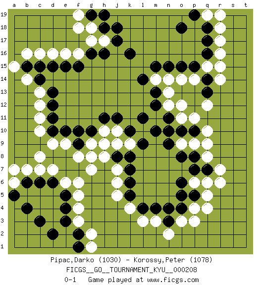 Last move : 0-1 2021 August 16 20:11:29 [Event "FICGS__GO__TOURNAMENT_KYU__000208"] [Site "FICGS"] [Date "2021.03.30"] [Round "1"] [Black "Pipac,Darko"] [White "Korossy,Peter"] [Result "0-1"] [Rating 1 "1030"] [Rating 2 "1078"] 1.c3 q4 2.q16 d16 3.c15 c16 4.d15 e16 5.e15 c10 6.d10 c11 7.d11 c13 8.d13 c8 9.d8 d7 10.e7 d9 11.e8 e9 12.k10 g9 13.d6 c7 14.g8 e6 15.e5 f6 16.f7 g7 17.f10 h8 18.g10 q10 19.k16 g17 20.g16 h17 21.h16 f3 22.e3 f5 23.e4 f4 24.j8 j7 25.h9 f8 26.k7 j6 27.k6 r14 28.q14 r15 29.q13 r16 30.q17 r17 31.p10 n10 32.n9 p11 33.o10 o11 34.n11 n12 35.m10 q12 36.m12 n13 37.m13 n14 38.m15 q15 39.p15 p14 40.o15 o14 41.n15 o3 42.j17 f16 43.f15 r7 44.q7 r6 45.o4 p3 46.p5 m3 47.m4 k4 48.l4 l3 49.k5 j5 50.f2 g2 51.f1 g1 52.d2 q8 53.p8 q9 54.c6 b7 55.b6 r18 56.q18 q19 57.p19 r19 58.o18 q6 59.p7 b16 60.c14 c12 61.d12 b14 62.h18 f18 63.g19 f19 64.j18 g18 65.h19 p6 66.o6 a6 67.a5 a7 68.b4 p4 69.n3 n2 70.n4 q5 71.o5 p9 72.o8 o9 73.n10 m14 74.l14 o12 75.b15 a15 76.f9 g8 77.e10 j9 78.k8 h10 79.h11 j10 80.j11 k9 81.l9 h9 82.l11 pass 0-1 Here are the names of the openings (joseki) played in the four corners : Corner d16 : d16 c15 Hoshi (Hwajeom, Seongjeom, Xingwei`) 4-4 Point. The star or hoshi (4-4) point, emphasizing influence at the potential expense of territory. Corner d4 : c3 c8 San-San (Sam-Sam, San-San) 3-3 Point. The San-San (3-3) point, emphasizing territory at the expense of influence. Corner q16 : q16 r14 Hoshi (Hwajeom, Seongjeom, Xingwei`) 4-4 Point. The star or hoshi (4-4) point, emphasizing influence at the potential expense of territory. Ikken Kakari (Hankan Keolch'im, Yi Gua`jiao~, 1-Space Low Approach). White 2 is the standard approach move to the 4-4. Corner q4 : q4 n9 Hoshi (Hwajeom, Seongjeom, Xingwei`) 4-4 Point. The star or hoshi (4-4) point, emphasizing influence at the potential expense of territory. Player White won this Go (weiqi, baduk) game. Follow this game move after move (download)On the second line six die, eight live. (Anonymous) He who is a good ruler must first have been ruled. (Aristotle)