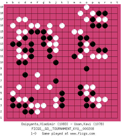 Last move : 1-0 2021 June 26 18:10:28 [Event "FICGS__GO__TOURNAMENT_KYU__000208"] [Site "FICGS"] [Date "2021.03.30"] [Round "1"] [Black "Osipyants,Vladimir"] [White "Usan,Kavi"] [Result "1-0"] [Rating 1 "1083"] [Rating 2 "1078"] 1.q16 d4 2.c16 r4 3.p3 p4 4.o4 q3 5.p5 q4 6.o3 o5 7.n5 o6 8.n6 p6 9.k4 e16 10.d14 c17 11.d16 d17 12.e15 f16 13.f15 g3 14.d10 r17 15.r16 q17 16.p17 p18 17.o18 o17 18.p16 n18 19.q18 o19 20.r18 k16 21.p13 q11 22.q12 r11 23.r12 p11 24.c3 c4 25.d3 e3 26.e2 f2 27.e4 f3 28.b4 b5 29.b3 c6 30.d2 f6 31.d8 j3 32.k3 j4 33.k5 n15 34.n13 c12 35.d12 c11 36.c10 d11 37.e11 d13 38.e12 c14 39.e13 b16 40.c13 c15 41.b13 d15 42.g15 h16 43.j10 h13 44.h14 j14 45.g13 h15 46.g14 j12 47.h12 j13 48.h11 o13 49.o14 o12 50.n14 m15 51.n12 f8 52.j7 h6 53.o9 n11 54.m11 1-0 Here are the names of the openings (joseki) played in the four corners : Corner q4 : r4 p3 Komoku (Somok, Xiao~mu`) 3-4 Point. The komoku (3-4) point is the traditional corner enclosure move.. Ikken Kakari (Hankan Keolch'im, Yi Gua`jiao~, 1-Space Low Pincer). The small knight move is the basic approach move to the 3-4 point stone. It has been continually used for over four centuries. There are limitless variations, with new moves constantly being discovered. Black 2 opens the door to a treaure store of joseki. Corner d16 : c16 e16 Komoku (Somok, Xiao~mu`) 3-4 Point. The komoku (3-4) point is the traditional corner enclosure move.. Ikken Takagakari (Hankan Nop'dakeolch'im, Yi Gaogua`jiao~, 1-Space High Approach). The 5-4 approach move has become more popular in modern times, as modern Go emphasizes speed and influence. Corner q16 : q16 r17 Hoshi (Hwajeom, Seongjeom, Xingwei`) 4-4 Point. The star or hoshi (4-4) point, emphasizing influence at the potential expense of territory. Player Black won this Go (weiqi, baduk) game. Follow this game move after move (download)Don't defend - extend ! (Bill Taylor) You must have a dream in order to have it come true. (A.P.J. Kalam)