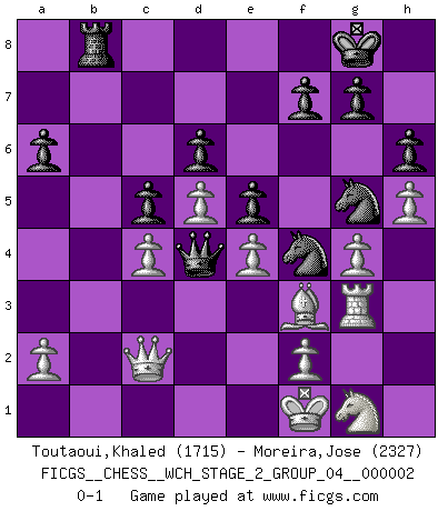 Last move : 0-1 2007 September 16 2:37:34 [Event "FICGS__CHESS__WCH_STAGE_2_GROUP_04__000002"] [Site "FICGS"] [Date "2007.07.11"] [Round "1"] [White "Toutaoui,Khaled"] [Black "Moreira,Jose"] [Result "0-1"] [WhiteElo "1715"] [BlackElo "2327"] 1.d4 c5 2.d5 e5 3.e4 d6 4.c4 Be7 5.Nf3 Bg4 6.Be2 Bxf3 7.Bxf3 Bg5 8.Bxg5 Qxg5 9.Nc3 Qd8 10.O-O Nf6 11.Re1 O-O 12.Re3 Nbd7 13.Be2 Re8 14.h4 Nf8 15.Rh3 h6 16.g4 Ng6 17.h5 Nf4 18.Rg3 Nh7 19.Bf3 a6 20.Ne2 b5 21.b3 Rb8 22.Rb1 bxc4 23.bxc4 Qa5 24.Qc2 Rxb1+ 25.Qxb1 Ng5 26.Kf1 Qd2 27.Ng1 Qd4 28.Qc2 Rb8 0-1 This chess game has been lost on time (started : 2007.07.11 18:39:4) Semi-Benoni (`blockade variation') Kingside Castling by player White (move 10) Kingside Castling by player Black (move 11) Player Black won this chess game. Follow this game move after move (download)What is the object of playing a gambit opening?... To acquire a reputation of being a dashing player at the cost of losing a game. (Siegbert Tarrasch) Über die Verhaftung Bobby Fischers: Warum es die Bush-Administration für nötig befindet einen 61 Jahre alten Mann zu hetzten, der für niemanden ausser sich selbste eine Gefahr darstellt ist ein Rätsel. (Nigel Short) El Ajedrez es en su esencia, un juego. En su forma, un arte. Y en su ejecución, una ciencia. (Baron Tassilo) Les pièces de l'échiquier étaient impitoyables. Elles le retenaient, elles l'absorbaient. Il y avait de l'horreur en cela, mais aussi une harmonie unique. Car, qu'y a-t-il dans le monde, à part les échecs ? (V. Nabokov) Excelling at chess has long been considered a symbol of more general intelligence. That is an incorrect assumption in my view, as pleasant as it might be. But for the purposes of argument and investigation, chess is, in Russkin-Gutman's words, 'an unparalleled laboratory, since both the learning process and the degree of ability obtained can be objectified and quantified, providing an excellent comparative framework on which to use rigorous analytical techniques.' (The Chess Master and the Computer, by Garry Kasparov - 2010)