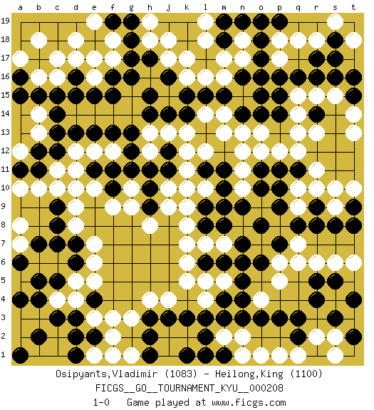 Last move : 1-0 2021 May 16 4:19:44 [Event "FICGS__GO__TOURNAMENT_KYU__000208"] [Site "FICGS"] [Date "2021.03.30"] [Round "1"] [Black "Osipyants,Vladimir"] [White "Heilong,King"] [Result "1-0"] [Rating 1 "1083"] [Rating 2 "1100"] 1.q16 d4 2.r4 d17 3.d15 d12 4.f15 f17 5.h15 g3 6.c3 c4 7.d3 e3 8.e2 f2 9.e4 f3 10.b4 e5 11.b5 d5 12.c7 d8 13.c8 d9 14.p3 r13 15.r14 q13 16.q8 r10 17.r9 q10 18.o16 r15 19.r16 s15 20.s16 q15 21.p15 k16 22.g16 h18 23.g17 j17 24.g18 e16 25.e15 c16 26.c15 b16 27.b15 f18 28.f19 e19 29.g19 d18 30.a16 a17 31.a15 b18 32.g13 n17 33.o17 n18 34.o18 n15 35.p14 q14 36.n14 l14 37.n16 m16 38.m15 m14 39.l15 l16 40.k15 j15 41.k14 k13 42.j14 n13 43.o14 j13 44.h14 o12 45.m4 k5 46.m6 k7 47.g11 j10 48.n9 m7 49.n7 n8 50.m8 l7 51.o8 s9 52.s8 q9 53.r8 s10 54.k3 j4 55.j3 l4 56.l3 m5 57.n5 l5 58.n4 n10 59.b12 c11 60.b11 b10 61.c12 d10 62.d13 e12 63.e13 f12 64.g12 g10 65.f10 f9 66.h10 g9 67.h9 j9 68.h11 h8 69.l13 m13 70.j11 k11 71.m18 m17 72.n19 l18 73.m19 l19 74.o19 h19 75.j16 k17 76.h17 j18 77.f11 e10 78.m10 l10 79.m11 l12 80.o10 n11 81.o11 n12 82.p11 p12 83.q11 r11 84.p9 q12 85.t9 t10 86.t8 r18 87.s18 q18 88.r17 s19 89.t15 t14 90.t16 t13 91.d2 a10 92.l8 k8 93.d7 e7 94.d6 e6 95.c5 a8 96.c9 c10 97.b7 a7 98.a6 b14 99.c14 a12 100.a11 r6 101.r5 q6 102.p7 p6 103.o6 s6 104.s5 p5 105.q3 o4 106.o3 s2 107.s3 r2 108.q2 t3 109.t4 t6 110.t2 s1 111.h3 h4 112.h2 g1 113.h1 e1 114.d1 f1 115.e11 d11 116.f13 b13 117.c13 h13 118.j12 k12 119.l9 k9 120.l11 k10 121.l6 k6 122.n6 m2 123.m3 n2 124.n3 o1 125.d16 e17 126.f16 c17 127.p10 q7 128.m9 q1 129.l2 l1 130.k1 p1 131.m1 n1 132.l1 b3 133.b2 a3 134.a4 a2 135.a1 t18 136.s17 p17 137.p16 p18 138.p19 o13 139.o15 h12 140.pass 1-0 Here are the names of the openings (joseki) played in the four corners : Corner d16 : d17 d15 Komoku (Somok, Xiao~mu`) 3-4 Point. The komoku (3-4) point is the traditional corner enclosure move.. Ikken Takagakari (Hankan Nop'dakeolch'im, Yi Gaogua`jiao~, 1-Space High Approach). The 5-4 approach move has become more popular in modern times, as modern Go emphasizes speed and influence. Corner q16 : q16 r13 Hoshi (Hwajeom, Seongjeom, Xingwei`) 4-4 Point. The star or hoshi (4-4) point, emphasizing influence at the potential expense of territory. Niken Kakari (Dukan Keolch'im, E`r Gua`jiao~, 2-Space Low Approach). Black typically answers by 7-3 or 3-5 (which is not joseki). Player Black won this Go (weiqi, baduk) game. Follow this game move after move (download)If a formation is symmetrical, play at the center. (Anonymous) Mandala - that's it! 16x16 squares as multiple of the four and the eight because of the Four Noble Truths and the Noble Eightfold Path. (Heinz-Georg Lehnhoff about Big Chess)