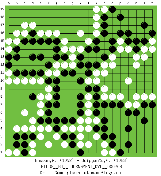 Last move : 0-1 2021 April 15 22:51:1 [Event "FICGS__GO__TOURNAMENT_KYU__000208"] [Site "FICGS"] [Date "2021.03.30"] [Round "1"] [Black "Endean,Andrew"] [White "Osipyants,Vladimir"] [Result "0-1"] [Rating 1 "1092"] [Rating 2 "1083"] 1.q4 d4 2.q16 d17 3.d15 f16 4.d13 c6 5.f3 h4 6.f5 l4 7.o3 q10 8.r14 k16 9.n16 d10 10.c11 c10 11.d11 e10 12.e11 e3 13.g7 e7 14.f10 f4 15.g4 e4 16.h5 g3 17.g5 j4 18.j5 k5 19.k6 l6 20.k7 q7 21.r6 r7 22.q6 r12 23.p7 p8 24.o7 m17 25.n17 m16 26.m15 l15 27.m14 h15 28.l14 k14 29.k13 j13 30.k12 o12 31.n13 o13 32.o14 n12 33.m12 n9 34.m9 o8 35.n7 m10 36.l9 l10 37.k10 n8 38.m8 m11 39.l12 p14 40.o15 p15 41.p16 q14 42.r15 r13 43.g14 h14 44.g13 j12 45.j11 h12 46.h11 g12 47.f12 g11 48.g10 f11 49.e13 b10 50.b11 a11 51.a12 a10 52.b13 c16 53.d16 c17 54.c15 b15 55.b14 b16 56.g15 g16 57.f15 e16 58.e15 m3 59.n4 m5 60.n5 n2 61.o2 o1 62.p1 n1 63.q2 f9 64.g9 f8 65.g8 m18 66.n18 n19 67.o19 m19 68.p18 s14 69.s15 s13 70.s7 s8 71.t7 t8 72.s5 r8 73.h3 f2 74.j3 k4 75.n3 l2 76.h13 j14 77.e5 d5 78.f7 e6 79.f6 t15 80.t16 t14 81.s17 l7 82.m7 l8 83.k8 a14 84.a13 a15 85.m4 k3 86.m6 l5 87.c3 c4 88.b3 b4 89.d3 d2 90.c2 b1 91.c1 d1 92.b2 a1 93.l11 n11 94.k1 h2 95.j2 k2 96.d8 e8 97.q15 pass 98.pass pass 99.pass pass 0-1 Here are the names of the openings (joseki) played in the four corners : Corner d16 : d17 d15 Komoku (Somok, Xiao~mu`) 3-4 Point. The komoku (3-4) point is the traditional corner enclosure move.. Ikken Takagakari (Hankan Nop'dakeolch'im, Yi Gaogua`jiao~, 1-Space High Approach). The 5-4 approach move has become more popular in modern times, as modern Go emphasizes speed and influence. Corner q4 : q4 l4 Hoshi (Hwajeom, Seongjeom, Xingwei`) 4-4 Point. The star or hoshi (4-4) point, emphasizing influence at the potential expense of territory. Player White won this Go (weiqi, baduk) game. Follow this game move after move (download)Learn to play under the stones. (Anonymous) Always remember that you are unique; just like everyone else. (Unknown)