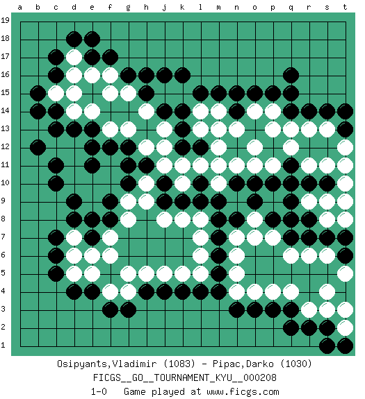 Last move : 1-0 2021 May 24 21:25:43 [Event "FICGS__GO__TOURNAMENT_KYU__000208"] [Site "FICGS"] [Date "2021.03.30"] [Round "1"] [Black "Osipyants,Vladimir"] [White "Pipac,Darko"] [Result "1-0"] [Rating 1 "1083"] [Rating 2 "1030"] 1.q16 q4 2.d4 d16 3.c6 d10 4.k4 k10 5.k16 p14 6.r14 q12 7.o3 o4 8.p3 p4 9.q3 k5 10.j4 j5 11.l4 l5 12.m5 n5 13.m4 n4 14.m6 l6 15.n3 n6 16.m7 k15 17.j16 j15 18.l15 l14 19.m15 m14 20.o15 o14 21.n14 n13 22.n15 r13 23.q15 k8 24.n8 o8 25.o9 n7 26.m9 m10 27.p8 o7 28.q9 p7 29.q7 q6 30.r7 r6 31.s7 s6 32.t6 t5 33.t7 s4 34.s2 r3 35.r2 s3 36.f3 f4 37.g3 g4 38.h4 h5 39.g16 g15 40.h15 h14 41.h16 f15 42.d8 e8 43.d9 e9 44.c10 d11 45.c17 q10 46.p10 p11 47.n10 n11 48.l10 m11 49.l9 l7 50.k9 l11 51.j10 k11 52.j9 j8 53.g10 j11 54.h11 h12 55.g12 g13 56.f12 f13 57.e12 d12 58.e13 e14 59.d13 f10 60.e17 d17 61.c16 d14 62.c14 c15 63.b15 d15 64.c13 g9 65.e18 f16 66.f17 e16 67.d18 d7 68.c7 d5 69.c5 d6 70.e4 e5 71.c11 h9 72.s14 s13 73.t13 t12 74.t14 s11 75.q14 q13 76.p15 l8 77.m8 h10 78.g11 r9 79.r8 o11 80.o10 c12 81.b12 t2 82.b14 f11 83.e11 e10 84.q2 s8 85.r10 s9 86.q11 r11 87.s10 t10 88.q10 t9 89.s1 t11 90.o13 p13 91.m13 t8 92.q8 o12 93.k14 l13 94.k13 m12 95.j14 j13 96.k12 j12 97.l12 m13 98.t1 t3 99.f5 g5 100.e7 f6 101.f8 g8 102.f9 f7 103.e8 e6 104.pass 1-0 Here are the names of the openings (joseki) played in the four corners : Corner q16 : q16 p14 Hoshi (Hwajeom, Seongjeom, Xingwei`) 4-4 Point. The star or hoshi (4-4) point, emphasizing influence at the potential expense of territory. Corner q4 : q4 o3 Hoshi (Hwajeom, Seongjeom, Xingwei`) 4-4 Point. The star or hoshi (4-4) point, emphasizing influence at the potential expense of territory. Ikken Kakari (Hankan Keolch'im, Yi Gua`jiao~, 1-Space Low Approach). Black 2 is the standard approach move to the 4-4. Corner d16 : d16 j16 Hoshi (Hwajeom, Seongjeom, Xingwei`) 4-4 Point. The star or hoshi (4-4) point, emphasizing influence at the potential expense of territory. Player Black won this Go (weiqi, baduk) game. Follow this game move after move (download)Nothing requires doing this or that, but necessity exists. (Pierre Audouard) There are lots of people who mistake their imagination for their memory. (Josh Bilings)