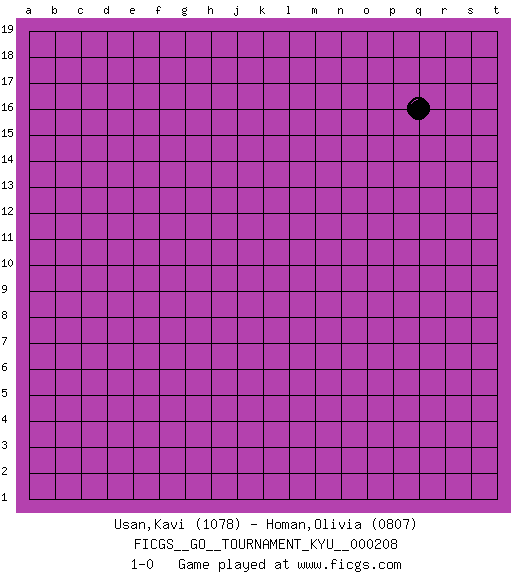 Last move : 1-0 2021 April 30 13:8:13 [Event "FICGS__GO__TOURNAMENT_KYU__000208"] [Site "FICGS"] [Date "2021.03.30"] [Round "1"] [Black "Usan,Kavi"] [White "Homan,Olivia"] [Result "1-0"] [Rating 1 "1078"] [Rating 2 "0807"] 1.q16 1-0 This go game has been lost on time (started : 2021.03.30 21:26:25) Here are the names of the openings (joseki) played in the four corners : Player Black won this Go (weiqi, baduk) game. Follow this game move after move (download)There are possible things, impossible things, and things that happen. Sometimes things happen that were impossible. (Pierre Audouard) In theory there is no difference between theory and practice. In practice there is. (Yogi Berra)