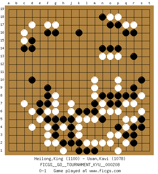 Last move : 0-1 2021 September 9 0:52:58 [Event "FICGS__GO__TOURNAMENT_KYU__000208"] [Site "FICGS"] [Date "2021.03.30"] [Round "1"] [Black "Heilong,King"] [White "Usan,Kavi"] [Result "0-1"] [Rating 1 "1100"] [Rating 2 "1078"] 1.q16 d4 2.q3 d17 3.d15 c15 4.c14 c16 5.d14 g17 6.f16 f17 7.g16 q5 8.q8 q7 9.p7 r7 10.r8 p6 11.o7 o6 12.m6 p3 13.r4 q4 14.r3 r5 15.s5 s6 16.s4 s8 17.s10 n7 18.n8 n6 19.m7 m8 20.o8 m9 21.r9 m5 22.k6 l5 23.l6 m10 24.k16 r17 25.r16 q17 26.p17 p18 27.o17 o18 28.n18 p9 29.p8 p10 30.r13 p13 31.p14 o13 32.o14 n13 33.n14 c7 34.d10 h4 35.j4 k5 36.j5 j6 37.h5 j7 38.g5 f4 39.g4 f3 40.g3 k3 41.j3 k4 42.f5 e5 43.e6 d6 44.e7 g7 45.f8 g8 46.f9 f6 47.f7 g6 48.j2 g2 49.h2 f2 50.k2 l2 51.k1 h1 52.l1 m2 53.m1 n2 54.p2 o2 55.p4 o3 56.n5 q2 57.r2 p1 0-1 This go game has been lost on time (started : 2021.03.30 21:26:25) Here are the names of the openings (joseki) played in the four corners : Corner d16 : d17 d15 Komoku (Somok, Xiao~mu`) 3-4 Point. The komoku (3-4) point is the traditional corner enclosure move.. Ikken Takagakari (Hankan Nop'dakeolch'im, Yi Gaogua`jiao~, 1-Space High Approach). The 5-4 approach move has become more popular in modern times, as modern Go emphasizes speed and influence. Corner q4 : q3 q5 Komoku (Somok, Xiao~mu`) 3-4 Point. The komoku (3-4) point is the traditional corner enclosure move.. Ikken Takagakari (Hankan Nop'dakeolch'im, Yi Gaogua`jiao~, 1-Space High Approach). The 5-4 approach move has become more popular in modern times, as modern Go emphasizes speed and influence. Corner q16 : q16 r17 Hoshi (Hwajeom, Seongjeom, Xingwei`) 4-4 Point. The star or hoshi (4-4) point, emphasizing influence at the potential expense of territory. Player White won this Go (weiqi, baduk) game. Follow this game move after move (download)One big eye kills one small eye. (Anonymous) Life is like internet, nothing interesting, but noone want to leave it. (Ilmars Cirulis)