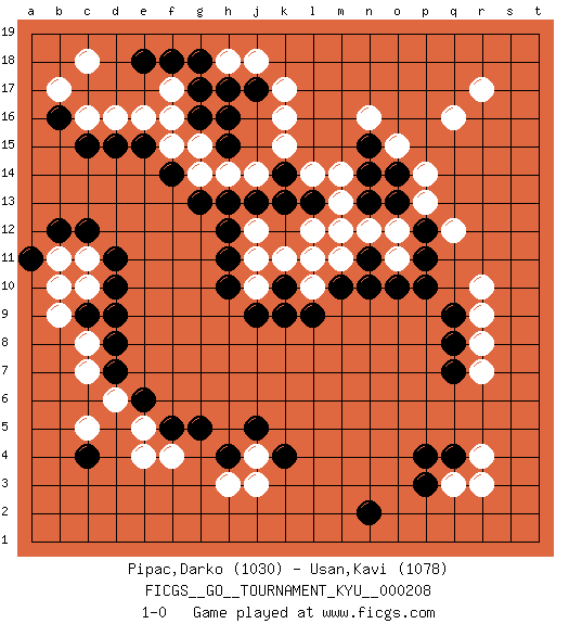 Last move : 1-0 2021 July 31 16:47:10 [Event "FICGS__GO__TOURNAMENT_KYU__000208"] [Site "FICGS"] [Date "2021.03.30"] [Round "1"] [Black "Pipac,Darko"] [White "Usan,Kavi"] [Result "1-0"] [Rating 1 "1030"] [Rating 2 "1078"] 1.c4 q16 2.q4 d16 3.p10 k16 4.k13 e4 5.f5 e5 6.e6 f4 7.g5 c5 8.d15 c16 9.c15 e16 10.e15 d6 11.d7 c7 12.d8 c10 13.d10 c8 14.d9 c11 15.d11 j12 16.k4 j10 17.k10 k11 18.j9 l10 19.k9 l12 20.l13 m13 21.j13 g14 22.h13 g15 23.g13 r3 24.h10 j11 25.h11 m11 26.n10 r7 27.q7 r8 28.q8 r9 29.q9 r10 30.n13 m14 31.l9 h3 32.h4 j3 33.n2 q3 34.p4 n12 35.o13 o12 36.n11 r17 37.m10 l11 38.p12 o11 39.o10 p13 40.p11 m12 41.o14 p14 42.n15 o15 43.n14 n16 44.c12 q12 45.h12 l14 46.f14 f15 47.b12 b11 48.c9 b9 49.a11 b10 50.b16 b17 51.h15 h14 52.h16 j14 53.k14 k15 54.j17 k17 55.g17 f17 56.g16 f16 57.f18 h18 58.g18 j18 59.e18 c18 60.h17 r4 61.p3 j4 62.j5 1-0 This go game has been lost on time (started : 2021.03.30 21:26:25) Here are the names of the openings (joseki) played in the four corners : Corner d4 : c4 e4 Komoku (Somok, Xiao~mu`) 3-4 Point. The komoku (3-4) point is the traditional corner enclosure move.. Ikken Takagakari (Hankan Nop'dakeolch'im, Yi Gaogua`jiao~, 1-Space High Approach). The 5-4 approach move has become more popular in modern times, as modern Go emphasizes speed and influence. Corner d16 : d16 d15 Hoshi (Hwajeom, Seongjeom, Xingwei`) 4-4 Point. The star or hoshi (4-4) point, emphasizing influence at the potential expense of territory. Corner q4 : q4 r3 Hoshi (Hwajeom, Seongjeom, Xingwei`) 4-4 Point. The star or hoshi (4-4) point, emphasizing influence at the potential expense of territory. Player Black won this Go (weiqi, baduk) game. Follow this game move after move (download)Territory is a closed space where time no longer exists. The transformation around it slower alter it, and sometimes it cracks open like a rotten egg at the least shock. (Pierre Audouard) It is not true that people stop pursuing dreams because they grow old, they grow old because they stop pursuing dreams. (Gabriel Garcia Marquez)