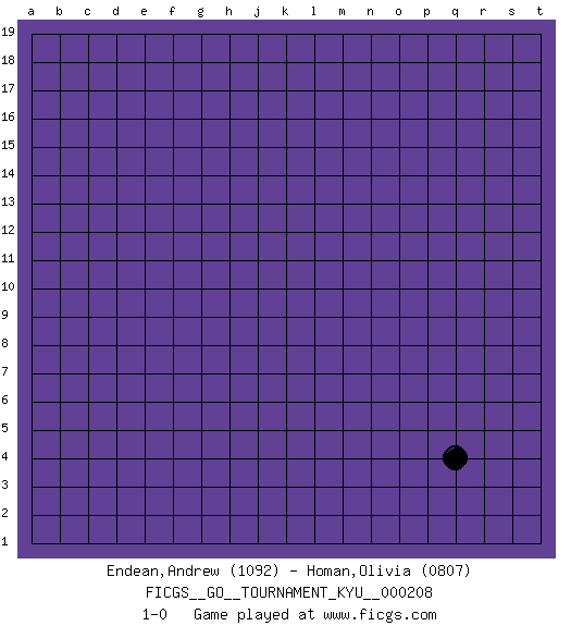 Last move : 1-0 2021 April 30 13:8:13 [Event "FICGS__GO__TOURNAMENT_KYU__000208"] [Site "FICGS"] [Date "2021.03.30"] [Round "1"] [Black "Endean,Andrew"] [White "Homan,Olivia"] [Result "1-0"] [Rating 1 "1092"] [Rating 2 "0807"] 1.q4 1-0 This go game has been lost on time (started : 2021.03.30 21:26:25) Here are the names of the openings (joseki) played in the four corners : Corner q4 : q4 1-0 Hoshi (Hwajeom, Seongjeom, Xingwei`) 4-4 Point. The star or hoshi (4-4) point, emphasizing influence at the potential expense of territory. Player Black won this Go (weiqi, baduk) game. Follow this game move after move (download)Don't count territory held by only one eye. (Anonymous) Ah, beer! The cause of, and the solution to, all of life's problems. (Homer Simpson)