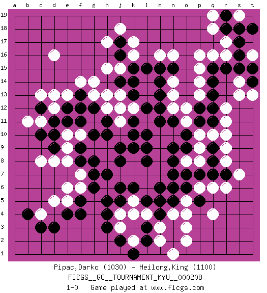 Last move : 1-0 2021 September 29 4:58:17 [Event "FICGS__GO__TOURNAMENT_KYU__000208"] [Site "FICGS"] [Date "2021.03.30"] [Round "1"] [Black "Pipac,Darko"] [White "Heilong,King"] [Result "1-0"] [Rating 1 "1030"] [Rating 2 "1100"] 1.d3 d5 2.e4 e5 3.f4 d8 4.k10 d16 5.p5 k16 6.n15 q16 7.q15 p15 8.q14 p14 9.q13 p13 10.p12 o12 11.p11 o11 12.o10 n10 13.n9 p10 14.o9 q10 15.q11 r11 16.n11 m10 17.m11 m9 18.l9 m8 19.n8 m7 20.o7 l6 21.k15 m16 22.m15 n16 23.q12 n12 24.m12 n13 25.m13 n14 26.m14 p16 27.l15 r9 28.n6 r6 29.j16 k17 30.e12 c13 31.c12 e13 32.f13 d12 33.d11 d13 34.f11 c11 35.c10 b11 36.d9 e9 37.d10 c8 38.f9 e8 39.f8 f7 40.g7 f6 41.g6 c4 42.f5 e6 43.h5 l4 44.k6 k5 45.j5 j4 46.h4 j3 47.h3 o4 48.m6 k7 49.j6 h8 50.j8 e10 51.e11 f10 52.g10 g9 53.g8 h9 54.h10 j7 55.h7 k8 56.j9 g13 57.n5 o5 58.m4 m3 59.o6 p6 60.p7 q6 61.n3 n4 62.m5 o3 63.l5 k4 64.l10 p9 65.l8 l7 66.q8 r8 67.q9 r10 68.q7 o8 69.n7 p8 70.k9 f14 71.f12 g14 72.g12 h13 73.j17 j15 74.j14 h15 75.j12 j13 76.k13 h12 77.h11 k12 78.k14 j11 79.k11 j12 80.l12 h17 81.c3 q4 82.r7 s7 83.n2 m2 84.j2 k2 85.k1 o2 86.l3 n1 87.l2 j18 88.r15 r16 89.s16 s14 90.s15 s13 91.s17 r17 92.r18 q18 93.r19 q19 94.t18 s19 95.s18 r12 96.t14 t16 97.t15 t13 98.b4 1-0 This go game has been lost on time (started : 2021.03.30 21:26:25) Here are the names of the openings (joseki) played in the four corners : Corner d4 : d3 d5 Komoku (Somok, Xiao~mu`) 3-4 Point. The komoku (3-4) point is the traditional corner enclosure move.. Ikken Takagakari (Hankan Nop'dakeolch'im, Yi Gaogua`jiao~, 1-Space High Approach). The 5-4 approach move has become more popular in modern times, as modern Go emphasizes speed and influence. Corner q16 : n15 q16 This joseki is unknown. A weak or weird move has probably been played in this corner. Corner d16 : d16 j16 Hoshi (Hwajeom, Seongjeom, Xingwei`) 4-4 Point. The star or hoshi (4-4) point, emphasizing influence at the potential expense of territory. Player Black won this Go (weiqi, baduk) game. Follow this game move after move (download)On the third line, four die, six live. (Anonymous) After growing wildly for years, the field of computing appears to be reaching its infancy. (John Pierce)