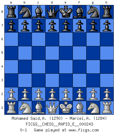 Last move : 0-1 2021 May 1 1:15:26 [Event "FICGS__CHESS__RAPID_E__000243"] [Site "FICGS"] [Date "2021.03.31"] [Round "1"] [White "Mohamed Said,Azaim"] [Black "Marcel,Alexis"] [Result "0-1"] [WhiteElo "1290"] [BlackElo "1284"] 0-1 This chess game has been lost on time (started : 2021.03.31 21:46:11) Player Black won this chess game. Follow this game move after move (download)The laws of Chess do not permit a free choice: you have to move whether you like it or not. (Emanuel Lasker) Die Partien sind immer verschieden, die Interviews immer die gleichen. (Garry Kasparov) El Ajedrez no es una pizca de inferior al violín, y tenemos un gran número de violinistas profesionales. (Mikhail Botvinnik) Ce qui caractérise les parties de combat, c'est que si le défenseur a constamment de difficiles problèmes à résoudre, l'attaquant doit chercher sans relâche de nouvelles possibilités d'attaque. (Koblentz) It's unlucky to be superstitious. (Dave Enteles)