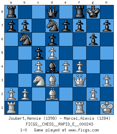 Last move : 1-0 2021 June 10 15:27:13 [Event "FICGS__CHESS__RAPID_E__000243"] [Site "FICGS"] [Date "2021.03.31"] [Round "1"] [White "Joubert,Hennie"] [Black "Marcel,Alexis"] [Result "1-0"] [WhiteElo "1398"] [BlackElo "1284"] 1.e4 g6 2.d4 Bg7 3.c4 c5 4.d5 d6 5.f4 Nf6 6.Nc3 O-O 7.Nf3 Nbd7 8.Bd3 Nb6 9.O-O Bg4 10.h3 Bxf3 11.Qxf3 Nfd7 12.Bd2 Bd4+ 13.Kh1 1-0 This chess game has been lost on time (started : 2021.03.31 21:46:11) Robatsch (Modern) defense Kingside Castling by player Black (move 6) Kingside Castling by player White (move 9) Player White won this chess game. Follow this game move after move (download)Chess opens and enriches your mind. (Saudin Robovic) Am wohlsten fühle ich mich, wenn ich sehe, wie sich mein Gegner im Todeskampf windet. (Robert James Fischer) Personalmente, yo prefiero mirar hacia el futuro en donde un programa de computadora gane el título mundial de Ajedrez. La humanidad necesita una lección de humildad. (Richard Dawkings) Il n'y a plus de joueurs du niveau de Jacob Murray dont la seule quête est le beau jeu, le plaisir de voir les pièces construire quelque chose. Sur 10 idées à la minute, 9 seront sans intérêt, la dernière s'avèrera géniale. (Christian Bauer) I just play for fun. (Anna Kournikova)