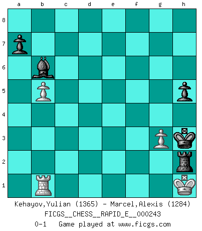 Last move : 0-1 2021 May 2 18:45:45 [Event "FICGS__CHESS__RAPID_E__000243"] [Site "FICGS"] [Date "2021.03.31"] [Round "1"] [White "Kehayov,Yulian"] [Black "Marcel,Alexis"] [Result "0-1"] [WhiteElo "1365"] [BlackElo "1284"] 1.d4 f5 2.g3 Nf6 3.Bg2 g6 4.Nf3 Bg7 5.O-O O-O 6.c4 d6 7.Nc3 Re8 8.Re1 Nbd7 9.e4 fxe4 10.Nxe4 Nxe4 11.Rxe4 e5 12.dxe5 Nxe5 13.Bf4 Bf5 14.Re1 Nxc4 15.Qd5+ Kh8 16.Qxc4 Qd7 17.Rab1 Bxb1 18.Rxb1 h6 19.Nh4 g5 20.Ng6+ Kh7 21.Bxb7 Rab8 22.Be4 d5 23.Ne5 Kh8 24.Nxd7 dxc4 25.Nxb8 gxf4 26.Na6 Rxe4 27.Nxc7 fxg3 28.hxg3 Re2 29.b4 Rxa2 30.b5 Bd4 31.Nd5 Bxf2+ 32.Kg2 c3 33.Nxc3 Rc2 34.Nd1 Bb6 35.Kh3 Kg7 36.Ne3 Bxe3 37.Rb3 Bb6 38.Rb1 Kg6 39.Rb3 h5 40.Kh4 Rc4+ 41.Kh3 Kg5 42.Kh2 Kg4 43.Kg2 Rc2+ 44.Kh1 Kh3 45.Rb1 Rh2+ 0-1 Dutch defense Kingside Castling by player White (move 5) Kingside Castling by player Black (move 5) 10 pieces endgame at move 33 : White KRNPP , Black KRBPP WHITE : King + 1 Rook 1 Knight 2 Pawns BLACK : King + 1 Rook 1 Bishop 2 Pawns 9 pieces endgame at move 36 : White KRPP , Black KRBPP WHITE : King + 1 Rook 2 Pawns BLACK : King + 1 Rook 1 Bishop 2 Pawns Player Black won this chess game. Follow this game move after move (download)There are two types of sacrifices: correct ones and mine. (Mikhail Tal) Wenn ich gewinne bin ich ein Genie. Wenn nicht, dann bin ich keines. (Robert James Fischer) Siempre es mejor sacrificar los hombres de tu oponente. (Savielly Tartakower) La vérité est comme le meilleur coup aux échecs : elle existe, mais il faut la chercher. (Arturo Perez-Reverte) Better than a thousand days of diligent study is one day with a great teacher. (Japanese proverb)