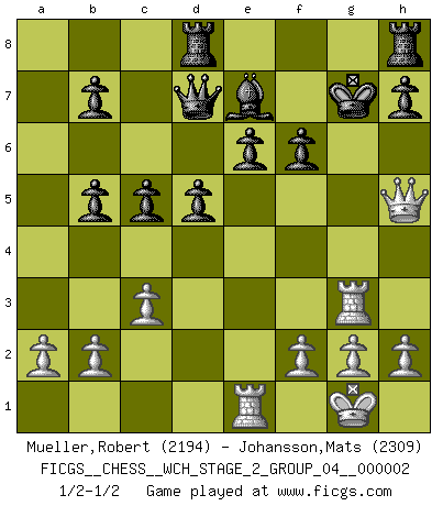 Last move : 1/2-1/2 2007 September 5 5:56:26 [Event "FICGS__CHESS__WCH_STAGE_2_GROUP_04__000002"] [Site "FICGS"] [Date "2007.07.11"] [Round "1"] [White "Mueller,Robert"] [Black "Johansson,Mats"] [Result "1/2-1/2"] [WhiteElo "2194"] [BlackElo "2309"] 1.e4 c5 2.Nf3 d6 3.Bb5+ Bd7 4.Bxd7+ Qxd7 5.O-O Nc6 6.c3 Nf6 7.d4 Nxe4 8.d5 Ne5 9.Re1 Nxf3+ 10.Qxf3 Nf6 11.Na3 e6 12.dxe6 fxe6 13.Bg5 Be7 14.Qe2 d5 15.Rad1 Rd8 16.Nb5 a6 17.Bxf6 gxf6 18.Qh5+ Kf8 19.Qh6+ Kf7 20.Qh5+ Kg7 21.Rd3 axb5 22.Rg3+ 1/2-1/2 Sicilian : Canal-Sokolsky attack, Bronstein gambit Kingside Castling by player White (move 5) This chess game ended in a draw. Follow this game move after move (download)It began to feel as though you were playing against Chess itself. - On playing against Robert Fischer. (Walter Shipman) Als er Schachweltmeister wurde ließ er praktisch alle stärksten Sovietspieler für sich arbeiten. Wenn ein auch nur mittelmässiger Meister ein Spezialist für eine bestimmte Eröffnung war, wurde er von Karpov gerufen. Das wurde alles geheim gehalten. (Mikhail Moiseyevich Botvinik) El Ajedrez no es una pizca de inferior al violín, y tenemos un gran número de violinistas profesionales. (Mikhail Botvinnik) Le moment que je préfère le plus dans une rencontre, c'est celui où je sens que la personnalité de l'adversaire se brise. (Robert Fischer) Who needs drugs and alcohol if he can play Big Chess at FICGS ? (Heinz-Georg Lehnhoff)
